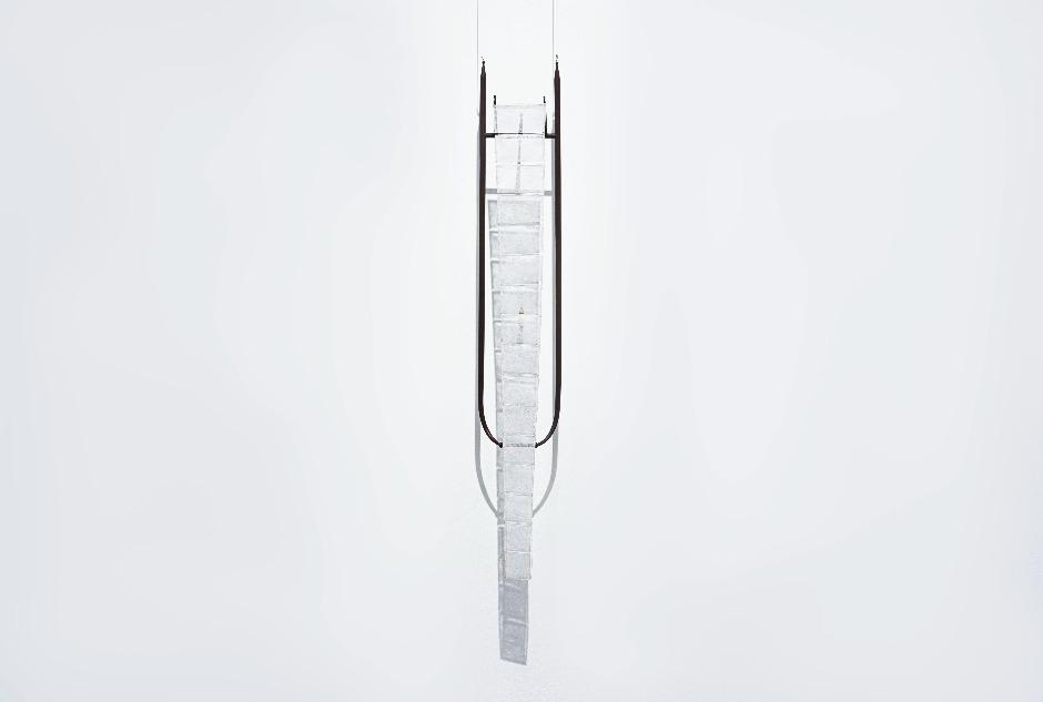 A primeira delas é a conexão entre arte e ciência. evoca os estudos sobre geometria descritiva, de autoria de Gaspard Monge (1746-1818). Em poucas palavras, trata-se do ramo da geometria cujo objetivo é representar objetos tridimensionais em plano bidimensional e, a partir das projeções, determinar distâncias, ângulos, áreas e volumes em suas verdadeiras grandezas. O termo “alfabeto da reta” se refere ao conjunto das posições genéricas que uma reta pode ter em relação aos planos de projeção. Na mostra, a força da linha está na ciência. Nela, a linhaganhatensãoefisicalidade–osargumentosmatemáticossustentam o enfrentamento entre a linha e o espaço.