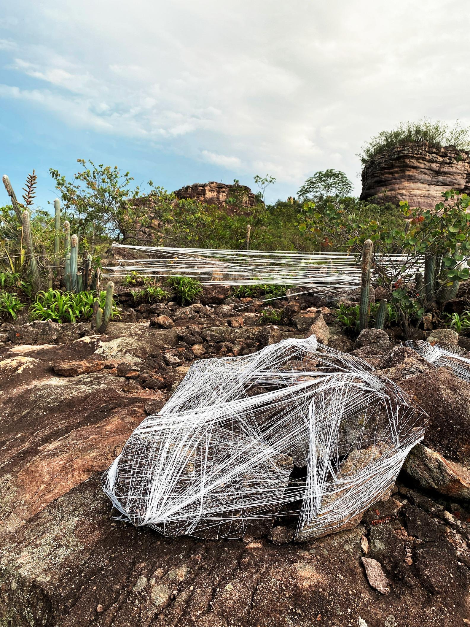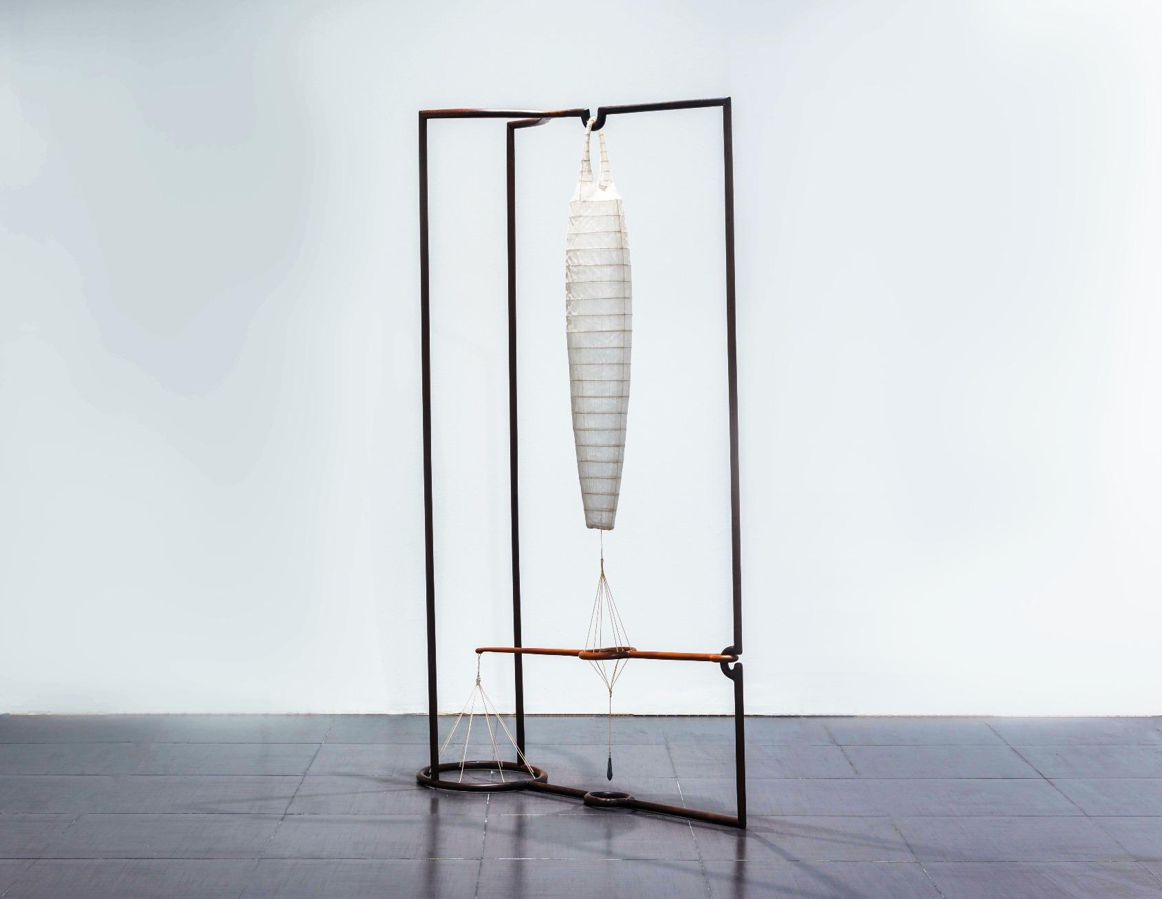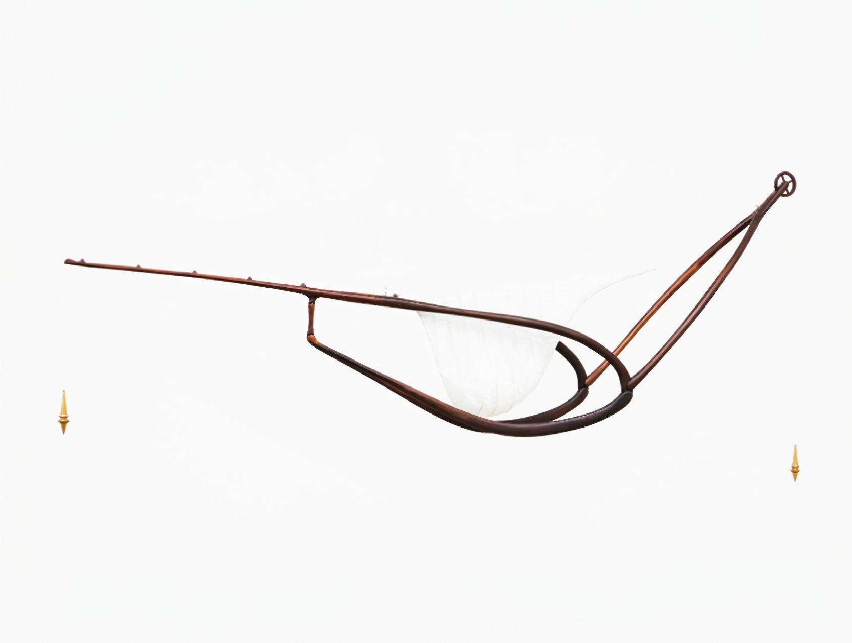 Assim como outras obras presentes na exposição que representam as soluções de sobrevivências, estéticas e criativas que foram sendo encontradas tanto por essas populações ribeirinhas da Amazônia, mas também pelo próprio artista, ao trabalhar com materiais como a madeira, o policarbonato, as linhas, o acetato, o bronze e as mantas, ele constrói e reconstrói todas essas formas às quais faz referência: armadilhas de caças; estruturas de embarcações; estruturas de asas das aves; a mandíbula de carcaças de animais;maquináriosribeirinhos;avara depesca(caniço)eoanzol.Étodoesse universo de formas que levou o artista, desde muito cedo, a constantes reflexõeseaodesejoàcriaçãoartística.