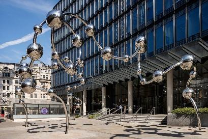 YayoiKusamafoireveladanaentradada estação de metrô mais movimentada de Londres. A peça é a primeira obra de arte pública permanente da artista japonesa no Reino Unido e, atualmente, a maior escultura pública de Kusama no mundo. Infinite Accumulation (2024) é um site specific de esferas prateadas espelhadas e interligadas com mais de nove metros de altura.