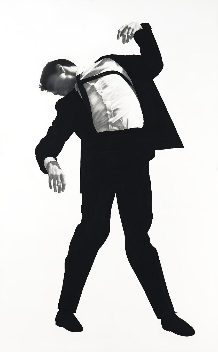 Longo já era considerado, no final dos anos 1970, um representante da chamada , um grupo livre de artistas nova-iorquinos que, em suas obras, se debruçava criticamente sobre asmídiasde massae aculturapop. Com a icônica série de desenhos de grande formato (19791983), em suas poses extremas e dinâmicas, ele expressou de maneira precisa o estado tenso e frágil daquela época. O crescimento financeiro, o imobiliário e a cultura dominavam Nova York, assim como o aumento da criminalidade, os problemas com drogas e a desigualdade social, que polarizavam a cidade. O neoconservadorismo da era Reagan e a ameaça da Guerra Fria contribuíam para um clima de insegurança. Os desenhos formais e rigorosos de Longo refletem esse sentimento. As figuras são representadas com “uniformes urbanos e roupas de filme ”, diante de um fundobranco,noespaçovazio,cadauma isolada, congelada em um momento de intensa movimentação e distorção corporal. São símbolos abstratos, para os quais o artista encontra uma correspondência em representações fortemente estilizadas, com contrastes em preto e branco, que têm sua origem em meios de comunicação e filmes nestes tons. Longo, assim, revela também a divisão interna vivida individualmente dentro de um tecido coletivo, marcado pela tensão e pela pressão social.