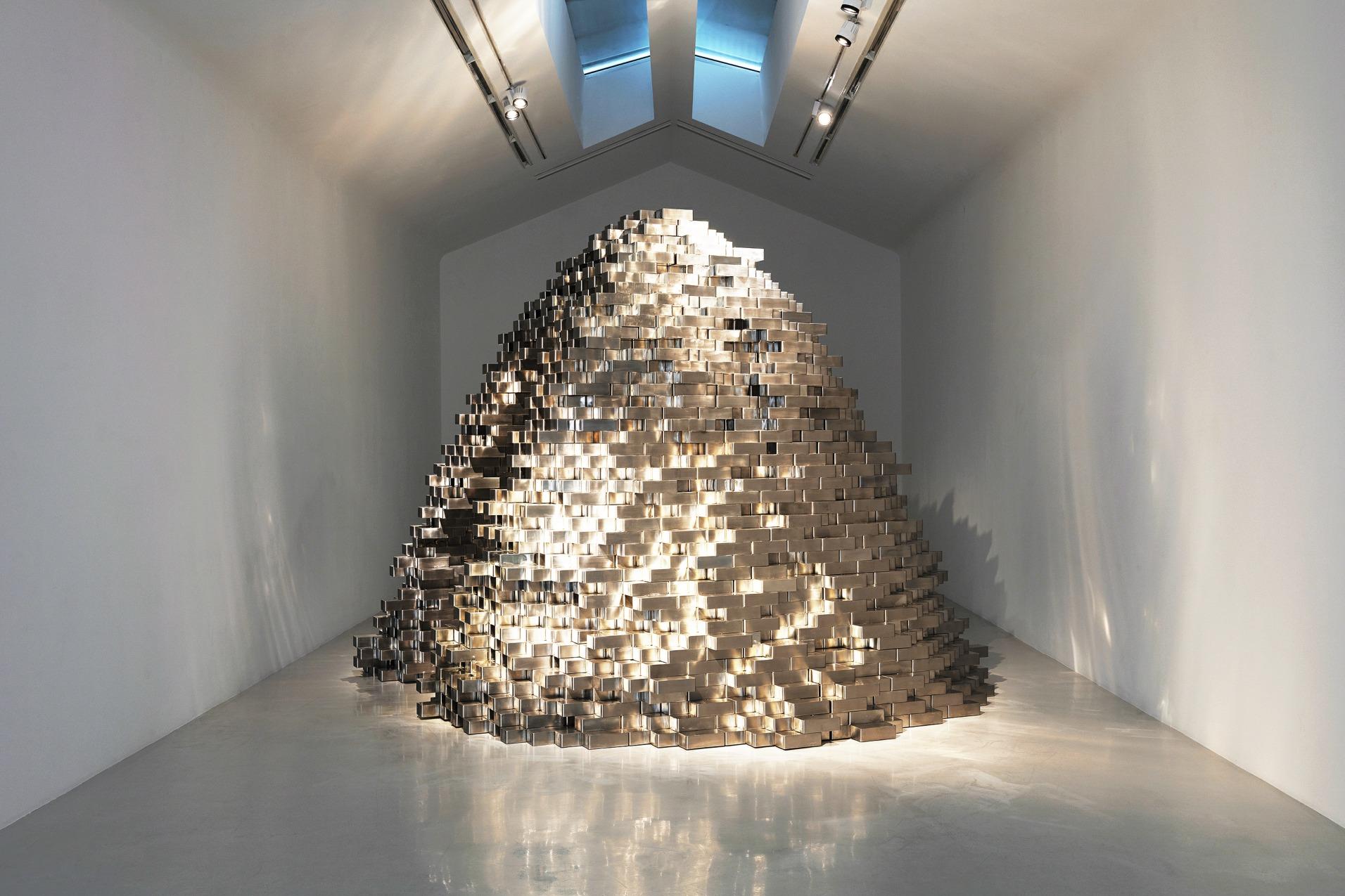 Tudo começou nas escadas exteriores do Petit Palais, com seu incrível tapete de tijolos de vidro azul (que apresentaremos no MON, mas numa outra versão, interna). Esse rio azul, que dialogava com as portas douradas da entrada do Petit Palais, era como um caminho para uma promessa de felicidade, para um grande Jardim do Éden. Othoniel também comemorava a ideia de reabrir uma exposição após a pandemia, e fez questão, desde as ruas, de se encontrar com o público. Esses tijolos azuis, que podiam ser vistos também na sala de exposição inferior, em tapetes ou em forma de altares, foram para o artista como um passaporte para sair da crise. O tijolo é o material dos pobres da Índia, que encontramos ao longo das estradas. Othoniel vê isso como uma esperança de sonho, algo muito humano: querer construir sua casa. Seus tijolos são frágeis e refletivos. Eles são um sonho em forma de tijolo.