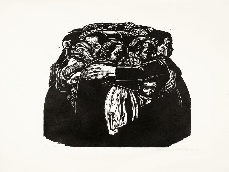 A gravura pertencente à série é uma imagem forte Nela, uma massa negra central se apresenta sob a interferência de poucas, mas fundamentais, linhas que determinam a densidade da composição. Um grupo de mulheres, mães unidas e abraçadas, protege seus filhos. As expressões são tensas, os olhos assustados, as mãos rígidas se posicionam como escudos, amparo e proteção para crianças. Já os filhos espreitam sob a muralha formada pelos corpos das mulheres. Como dado interessante, observa-se que as fisionomias das mães se assemelham à da artista, procedimento comum em outros trabalhos. Mulher, mãe e artista se integram ao tema do medo da guerra gerado pela própria humanidade. Por essa e outras criações, considera-se que ela cumpriu sua sentença: “É meu dever dar voz ao sofrimento dos homens”. A compaixão de Kollwitz pelos necessitados lhe rendeu reconhecimento internacional. Ela já teve