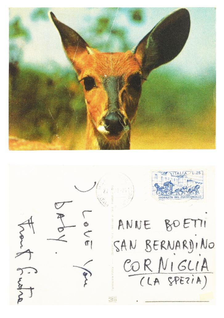 taoísta; o princípio feminino, escuro, receptivo, eternamente conectado ao ativo, luminoso e extrovertido, mas também o e o , nome dentro do qual entrava durante as suas peregrinações no Oriente Médio, nos territórios do Afeganistão onde encarregava os mestres tecelões para produzir suas maravilhosas tapeçarias que voltavam à Europa meses ou até anos depois do primeiro contato com os artesãos. , também, proporciona o começo das intervenções realizadas com o auxílio inconsciente dos correios: enviando 50 cópias da fotomontagem aos amigos, em formato de cartão postal, abria-se uma relação parassimpática entre o artista e o seu mesmo ato criativo, completando-o com o trabalho de pessoas externas, na mesma dinâmica que envolvia as tapeçarias: ativando processos.