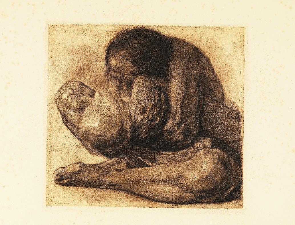 Outra forte experiência feminina, abordada por Kollwitz, é, sem dúvida, a maternidade como símbolo duplo de amor e dor. A artista, muitas vezes, aborda a mulher idosa que perde seu filho, ou, ainda, a mãe que tenta proteger sua prole. É a figura da mulher que mais aparece em condições miseráveis. São elas que precisam lidar com a fome, a doença, a morte e os desdobramentos da guerra. A artista mostra com crueza as circunstâncias impostas às mulheres em uma sociedade dominada por homens, pelo capitalismo e pela luta de classes. A essa altura, é possível perceber que sua vida foi marcada por reviravoltas. Em 1919, ela foi nomeada para a Academia de Belas-Artes de Berlim. Dez anos mais tarde, suas obras foram exemplo para artistas da Associação de Artistas Plásticos Revolucionários (AAPR), fundada em Berlim e Dresden (1928-1929). Em 1933, passou a ser perseguida pelos nazistas, por suas convicções sociais. Seus trabalhos foram considerados “arte degenerada” e ela e o marido sofreram ameaças de serem levados para os campos de concentração. Em 1936, o casal decidiu abandonar Berlim. O refúgio nos EUA foi oferecido por um colecionador, mas ela recusou, preferindo ficar perto de sua família.