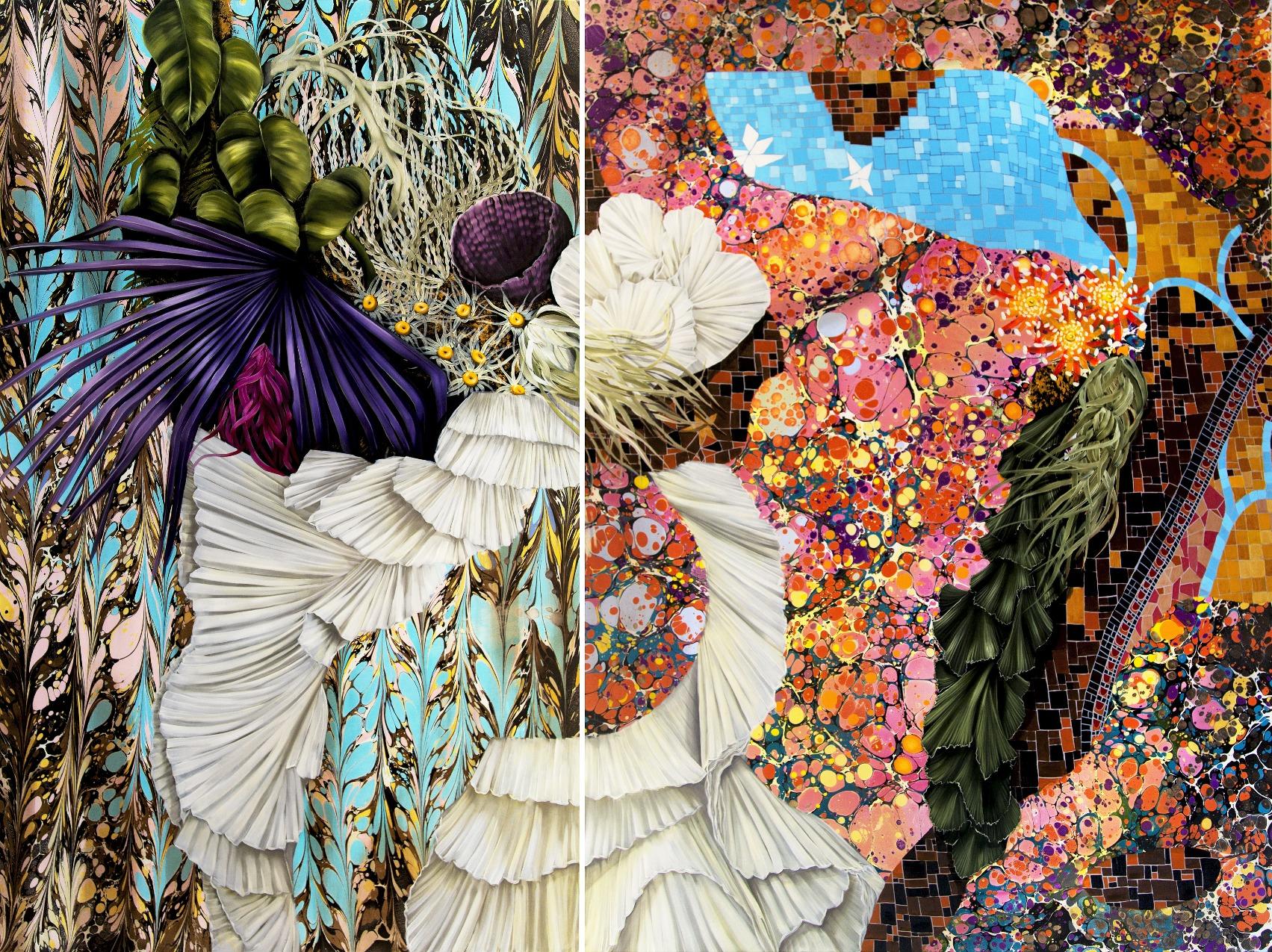 “O universo do Barroco me pegou desde cedo – tanto o europeu quanto o nosso, o mineiro. Sempre me impressionou esse excesso, essa dramaticidade e, ao mesmo tempo, essa delicadeza dos detalhes, da luz, da sobreposição”, completa Mariana, “Minha relação com o Barroco é menos como uma referênciadiretaemaiscomoumaatmosfera.Eumeinteresso por essa construção do excesso, pela tensão entre o visível e oinvisível,entreosublimeeogrotesco.Obarrocomeensinou a pensar a imagem como algo que transborda – que não se contém em si mesma. E isso aparece nas minhas obras nos detalhes, nas camadas, na luz, nos volumes que se insinuam mesmo na bidimensionalidade.”