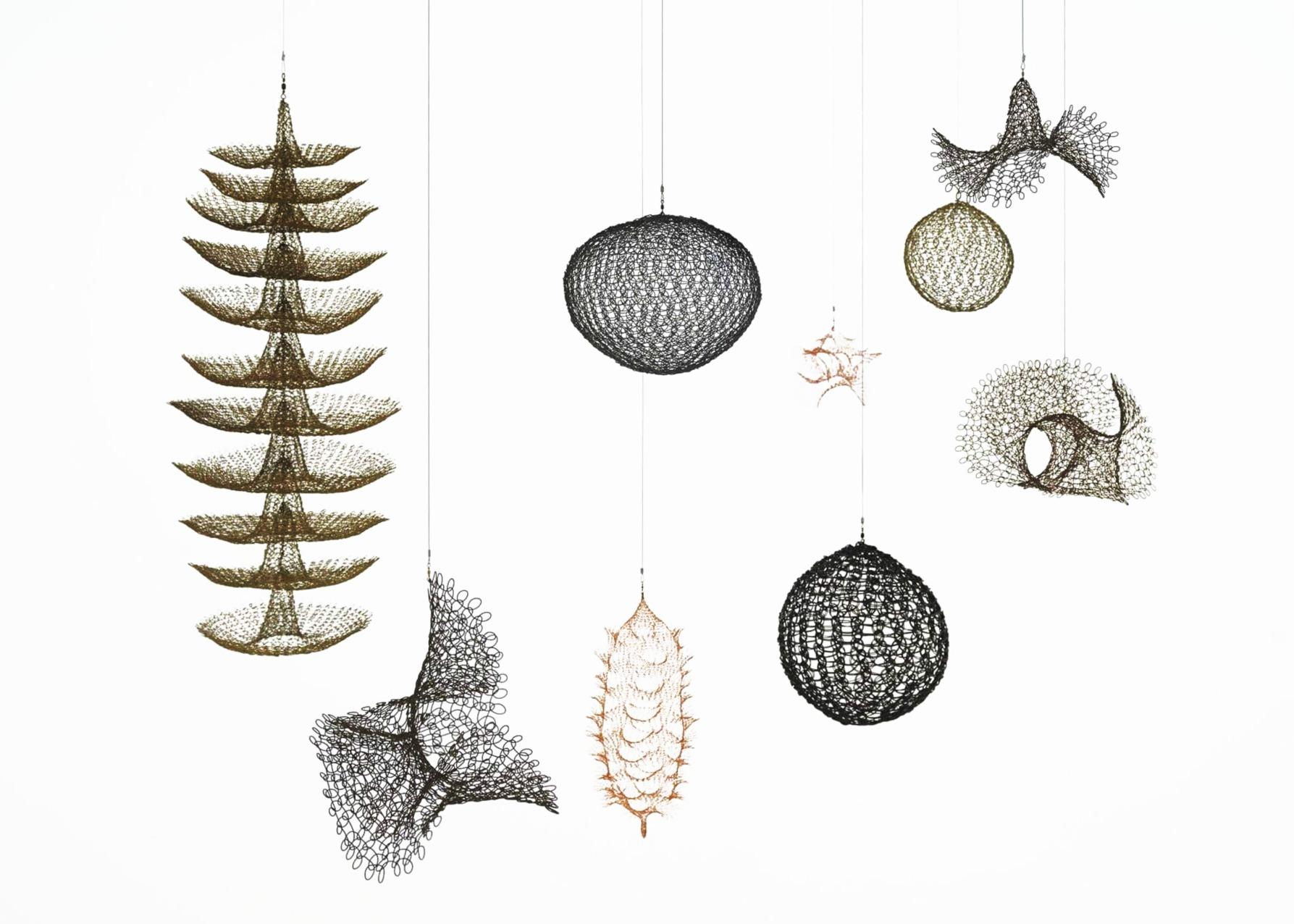 No final da década de 1970, Asawa iniciou uma série de esculturas em miniatura feitas com arame extremamentefino,meticulosamente entrelaçado. A ideia de trabalhar em escala reduzida e testar tanto sua visão quanto sua destreza surgiu quando ela começou a perceber os efeitosdoenvelhecimentosobresua visão. “Estou ficando cega fazendo essas miniaturas de crochê”, escreveu em uma carta a um amigo. “Decidi fazê-las antes que meus olhos mudem ainda mais.” Asawa recorreu ao seu vasto vocabulário escultórico, apresentando suas formas características em outra escala.