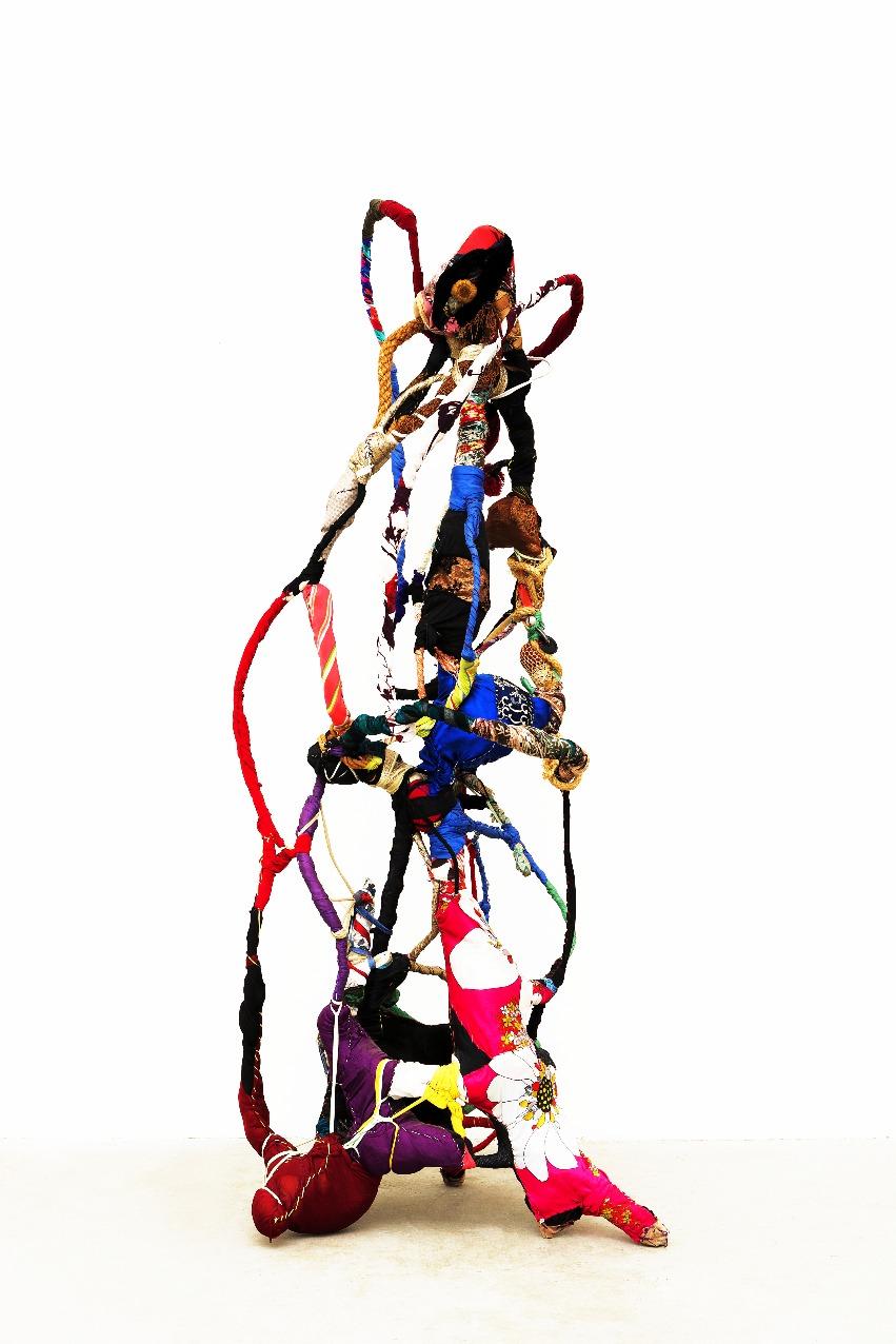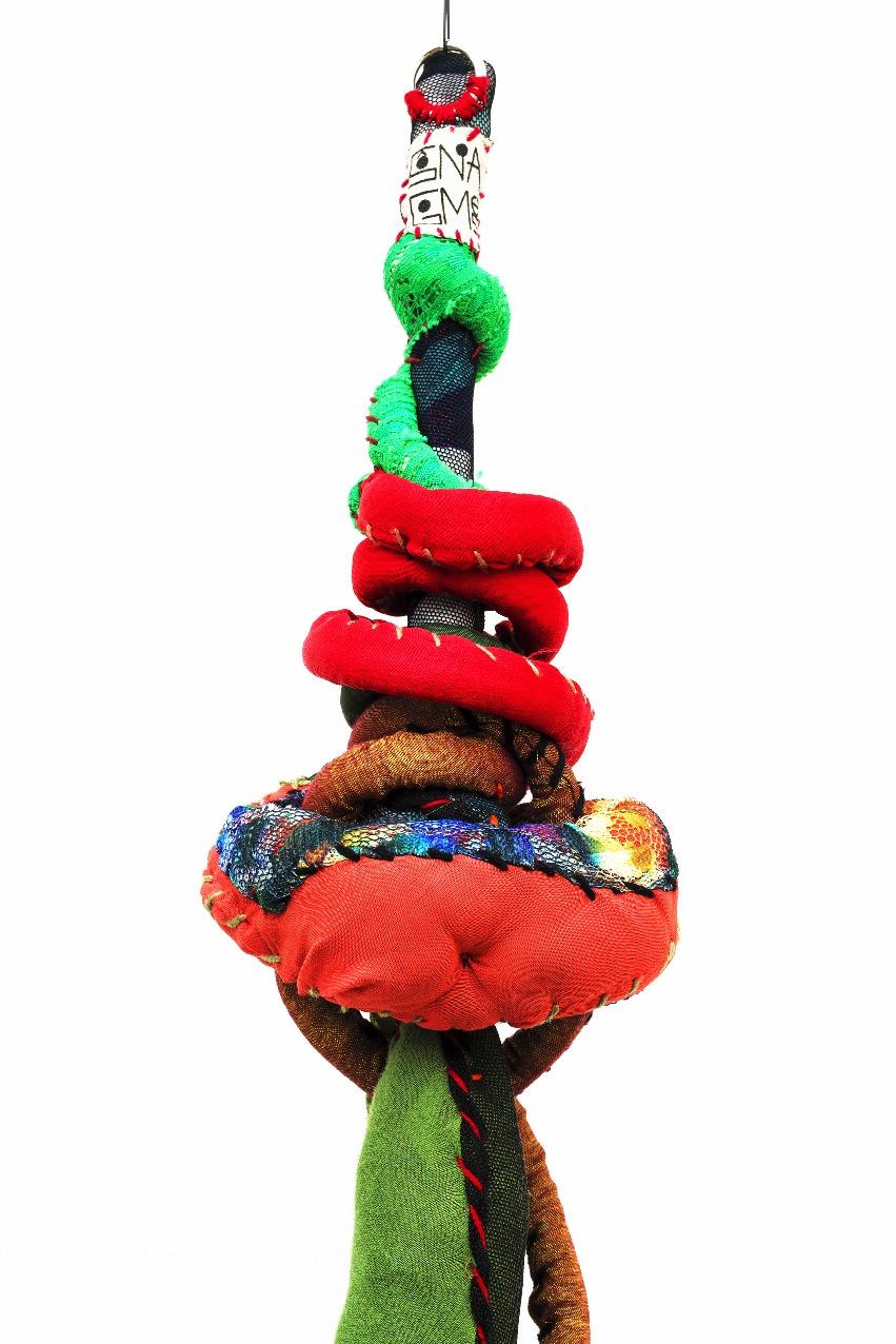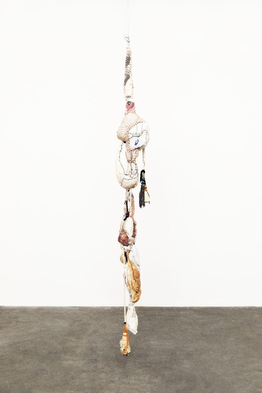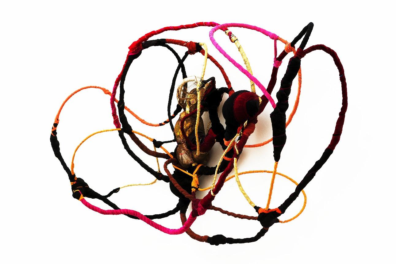 E a obra de Sonia Gomes materializa essa potência. Nascida em Caetanópolis, Minas Gerais, a artista construiu uma trajetória marcada por experimentação e ruptura de fronteiras entre arte, artesanato e práticas cotidianas. Suas esculturas e instalaçõessãocompostaspor tecidos,linhas,rendas,cordas, objetosencontrados,aramese madeira, frequentemente reaproveitando materiais impregnados de memórias e afetos. Seu processo criativo envolvecosturas,amarrações, torções, sobreposições e cortes, formando abrigos, tramas e invólucros que dialogam com a escala do corpo e com a ancestralidade. Cada obra é resultado de uma pesquisamanualesensível,em que o gesto de torção, embrulho e costura evocam práticas femininas e saberes transmitidosporgerações,em especialpelaavóbenzedeirae parteira.