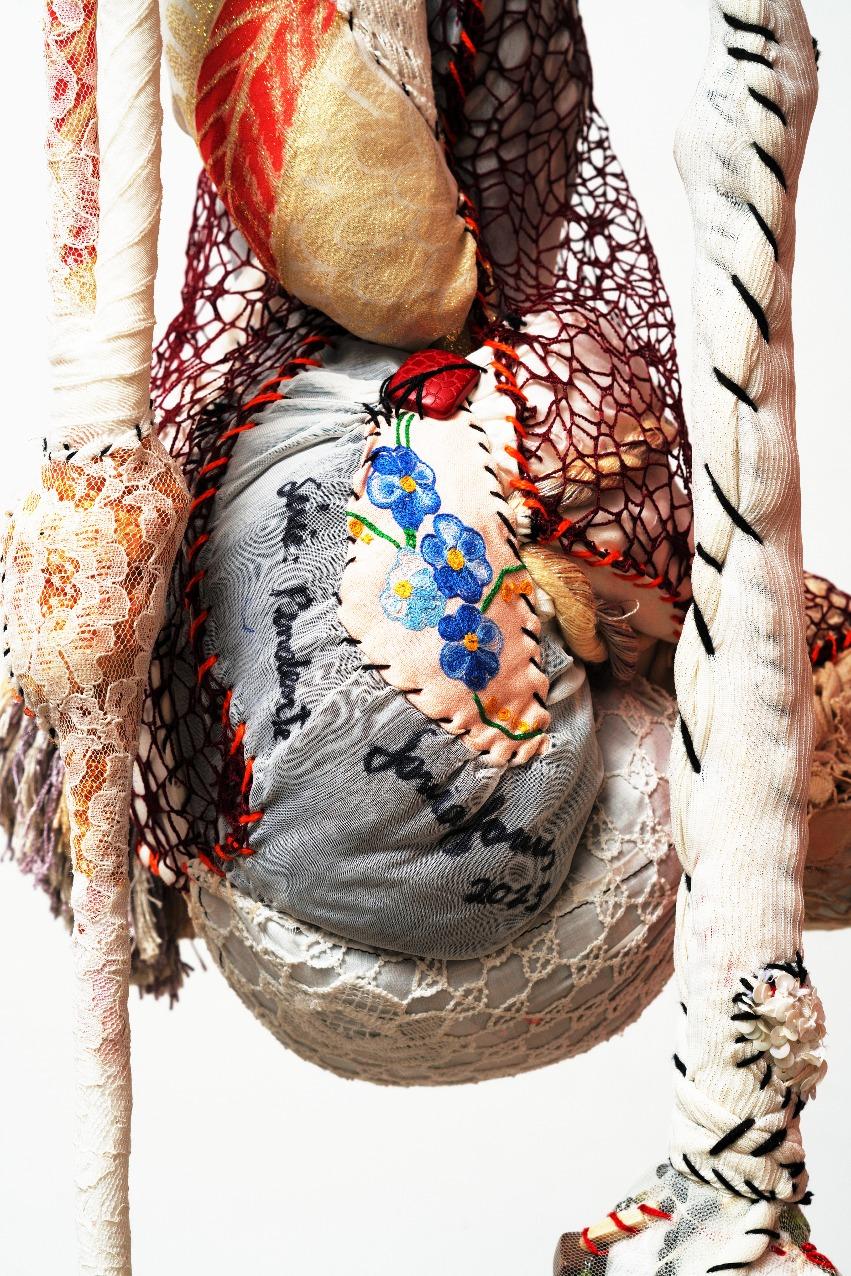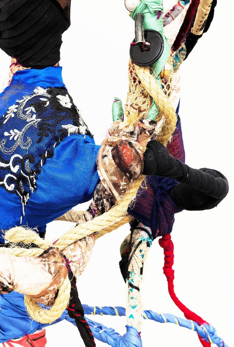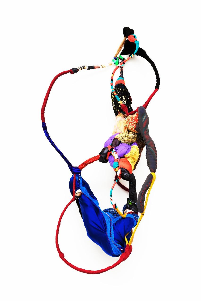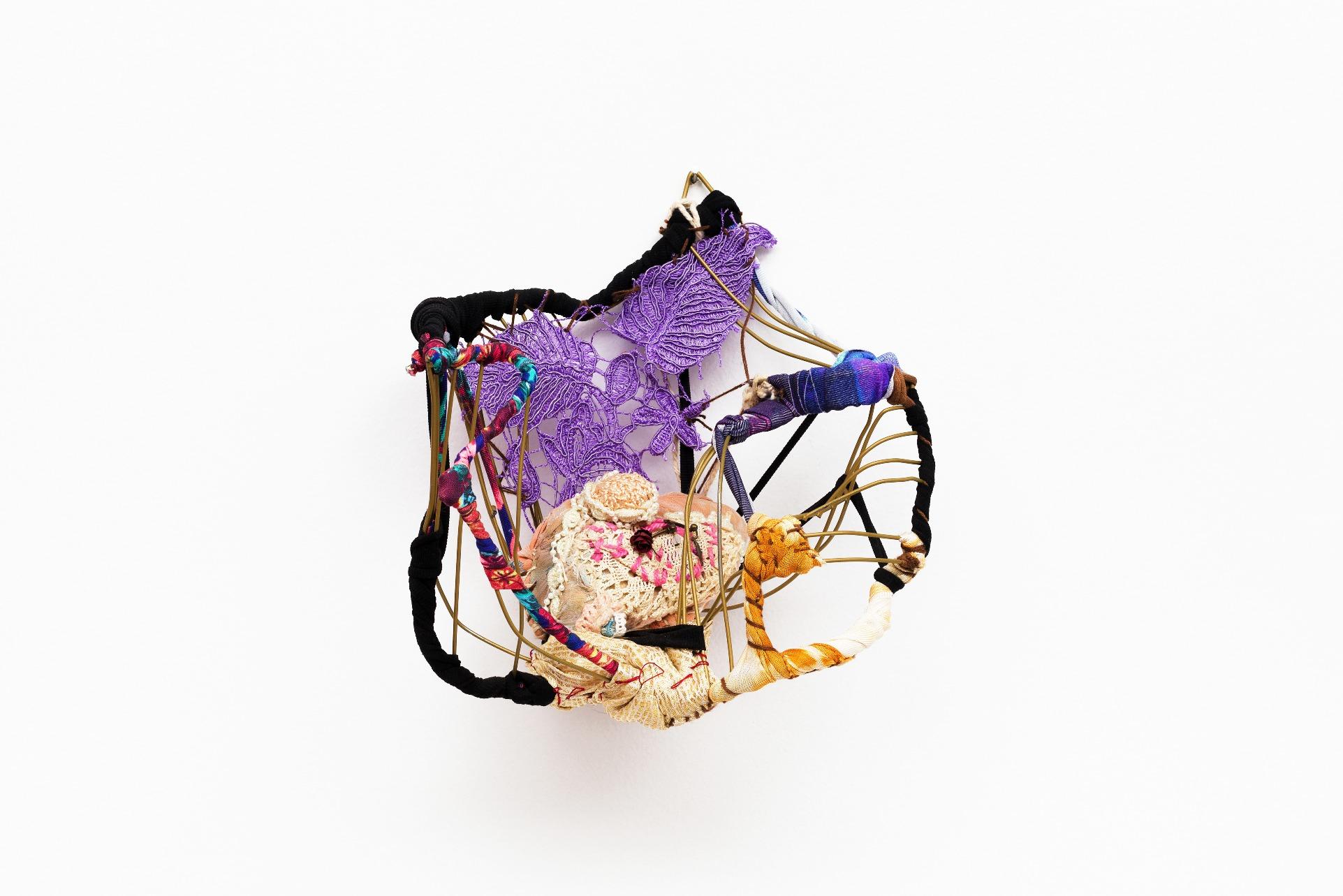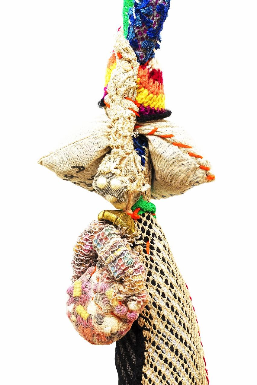 E a obra de Sonia Gomes materializa essa potência. Nascida em Caetanópolis, Minas Gerais, a artista construiu uma trajetória marcada por experimentação e ruptura de fronteiras entre arte, artesanato e práticas cotidianas. Suas esculturas e instalaçõessãocompostaspor tecidos,linhas,rendas,cordas, objetosencontrados,aramese madeira, frequentemente reaproveitando materiais impregnados de memórias e afetos. Seu processo criativo envolvecosturas,amarrações, torções, sobreposições e cortes, formando abrigos, tramas e invólucros que dialogam com a escala do corpo e com a ancestralidade. Cada obra é resultado de uma pesquisamanualesensível,em que o gesto de torção, embrulho e costura evocam práticas femininas e saberes transmitidosporgerações,em especialpelaavóbenzedeirae parteira.