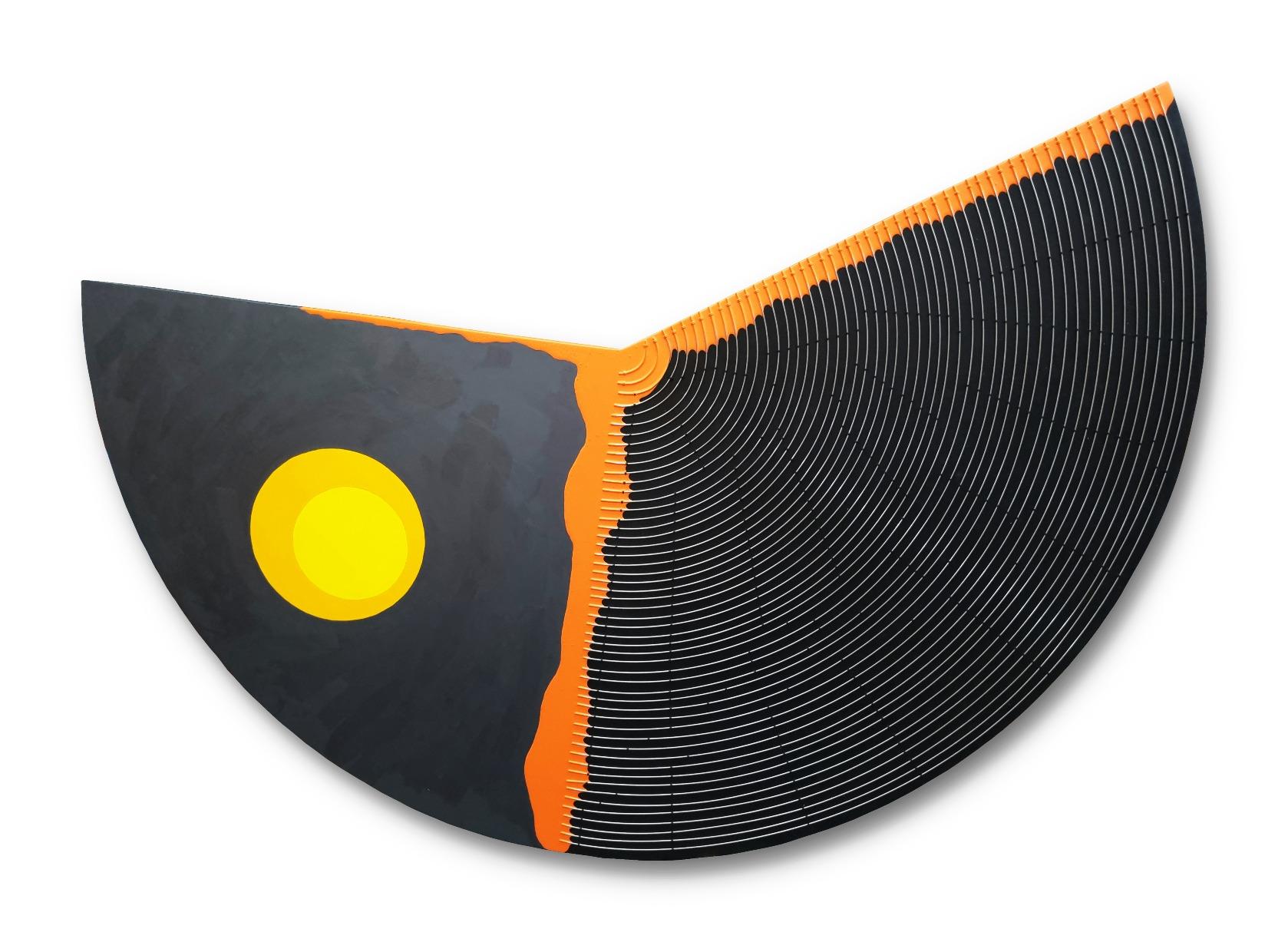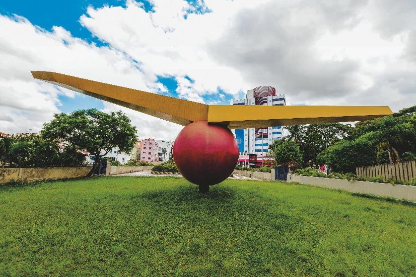 “Em 2002, eu retorno à escultura de forma extremamente impactante para a minha vida e acabo realizando uma grande exposiçãonoMuseudaCasaBrasileira, em São Paulo, sendo convidado a instalar uma escultura na praça do metrô no bairro Jardim São Paulo, perto de Santana. Essa escultura acontece exatamente quando eu estou me voltando um pouco mais para algumas questões do candomblé e para suas simbologias. Em algumas esculturas desse período, eu trabalheitangenciandoessaquestão de cultura afro e seu significado místico. Nesse momento, criei a obra , feita em aço comum, porém, com uma estrutura metálica interna muito forte, trabalhada com uma tecnologia de ponta de caldeiraria em aço e, de certa forma, foi sendo desenvolvida a partir dos conceitos que eu já vinha impondo ao meu trabalho com relação à geometria e seus significados. Essa escultura foi brotando praticamente de uma forma meio autônoma e, somente quando ela ficou pronta, eu entendi por queeuestavafalando muito deXangô. Engraçado queteveum pai de santo amigo meu que disse: “Enquanto você fazendo aescultura,elaédeExuenãodeXangô”.Equandoaexposição foi inaugurada, eu lembro que ele estava na abertura e disse: “Agora essa peça se tornou de Xangô”. Há uma identidade pessoal com a peça, mesmo sendo uma escultura de grandes dimensões, que mede cerca de 24 metros, e foi instalada em uma praça, um grande espaço público. A obra é composta por umagrandeesfera,comdoisprismasquesealternam,lançamse oposicionalmente, e foi necessário uma grande estrutura logística para montá-la e colocá-la no local. Esse trabalho continuaagregandooselementosqueeuconsideroorgânicos, como uma esfera vermelha, que representa o sangue, e as asas, como se fossem prismas, formando um conjunto voador em homenagem a Xangô, que é meu orixá.”