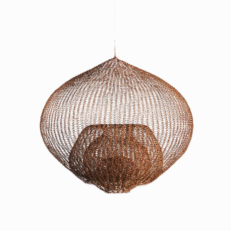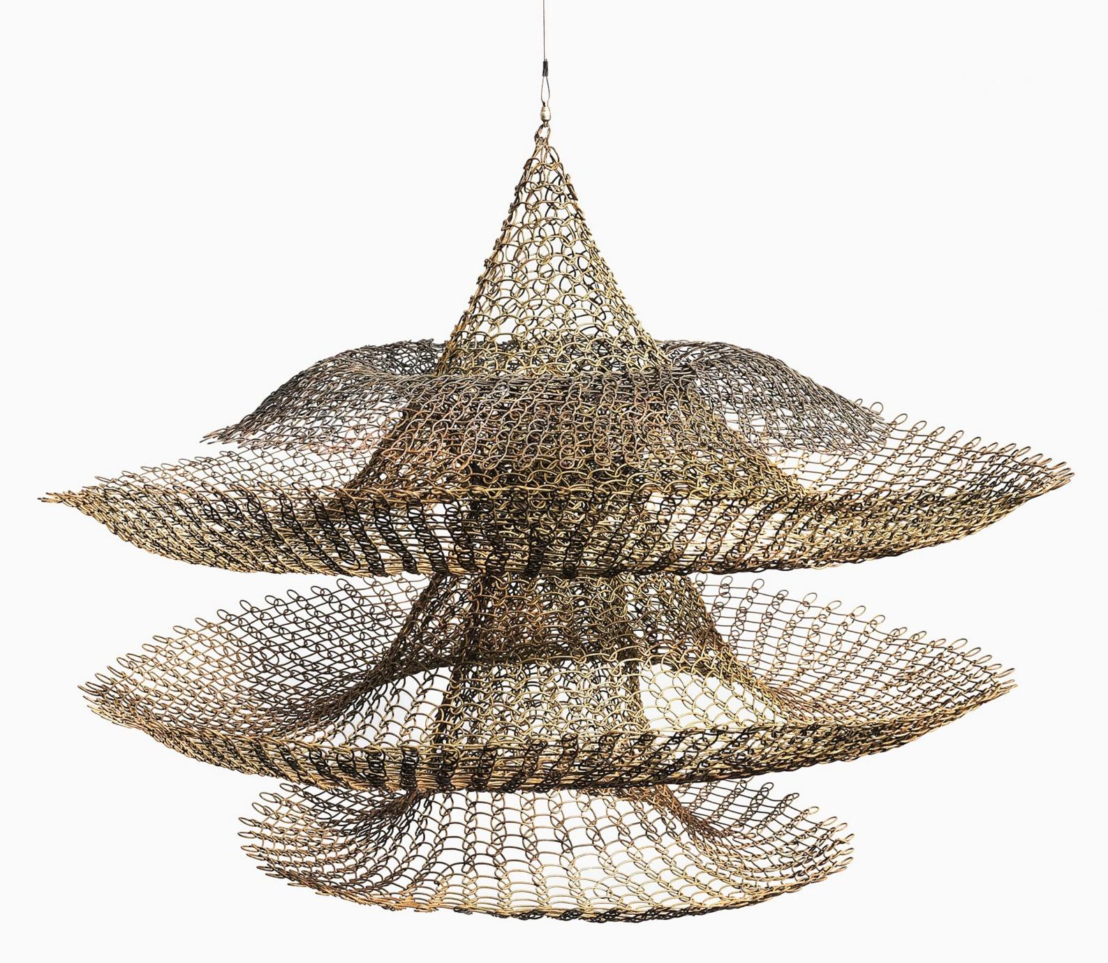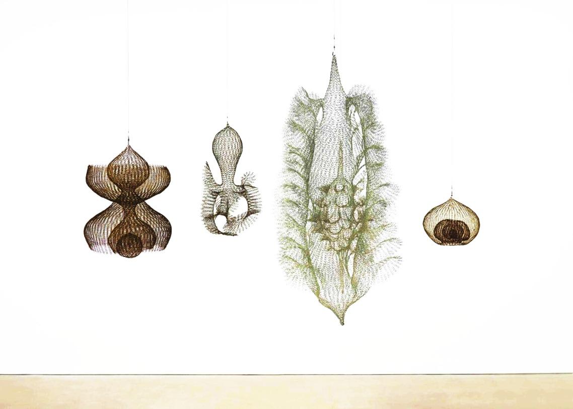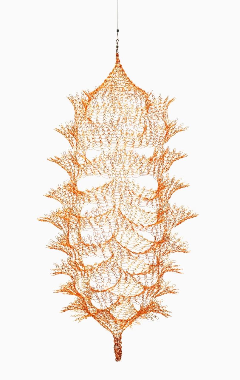 Asawa desenvolveu, ao longo da década de 1950, uma vasta gama de formas escultóricas utilizando arame industrial entrelaçado manualmente –aquiloqueelachamou,em1955,de o “vocabulário da minha escultura”. Essas formas se sobrepõem, aninham-se, interligam-se, ondulam e se desdobram em cascata, criando superfícies contínuas que delineiam volumes ao mesmo tempo em que permanecem porosas ao espaço ao redor. Embora suas estruturas compostas sejam simétricas e equilibradas, a experiência do observador em relação às formas pode mudar conforme o ponto de vista, a proximidade de outras obras eaqualidadedaluzaolongododia. Consideradas em conjunto, elas revelam a natureza iterativa de sua prática. “O trabalho é algo que dita uma maneira de crescer”, escreveu ela em 1952, “e, quanto mais se aprende sobre esse modo de crescimento, mais possibilidades se abrem para a criação de uma esculturaprópriadoprocesso”.