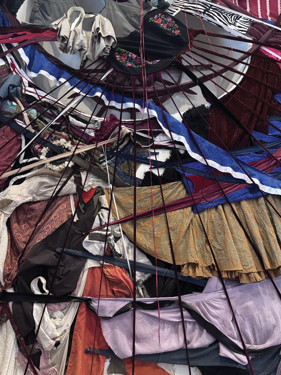 A poética dos retalhos e das sobreposições em Sonia Gomes habitaumaestéticadosmovimentos, elaborando uma linguagem visual e tátilquepropõesentidosprovisórios eoriginais.Suasesculturas,comoas séries , , e , apresentam formas orgânicas, curvas, espirais e volumes assimétricos, muitas vezes penduradasoususpensasnoespaço expositivo, criando ambientes imersivos e dinâmicos (e que ganharam força especial na referida mostra). O uso de tecidos desgastados, tramas imperfeitas e materiais reaproveitados traduz simbolicamente as complexidades e contradiçõesdaexistênciabrasileira como um todo, material e simbólica, acumulando memórias silenciadas e latências de formas inesperadas. O protagonismo da agulha, que une partes distintas, pode, com efeito, simbolizar a capacidade de costurar essasexperiênciaselembranças. Ainda que a agulha carregue uma ambiguidade:areparação,acuraea reconstrução, pode também ferir, pois,aoatravessarotecido,inscreve marcas de dor e memória. Sonia Gomes reconhece essa dualidade, afirmando que “o mesmo instrumento capaz de terebrar um tecidoparaferi-lopodeseracuraou a reparação de uma dor através de outra costura”. Assim, suas obras