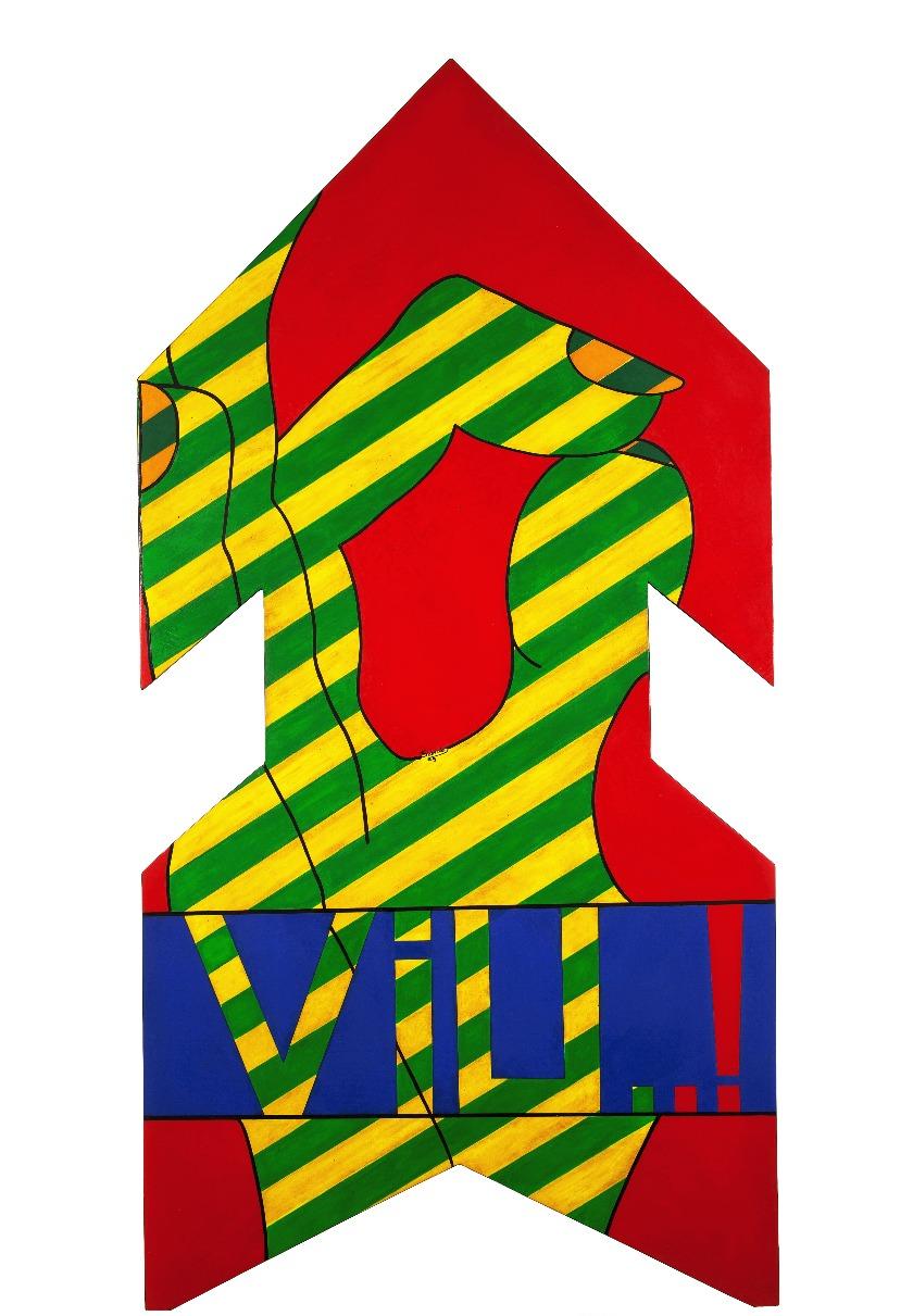 “ éumtrabalhodadécada de1960,momentoemqueo paísviviaumafortecensura em todas as áreas culturais. Naquele momento, eu utilizava a linguagemdoscartazesde cinema e das histórias em quadrinhos para poder fazeromeutrabalho,então haviaumsignificadográfico, quase ilustrativo de uma ideia plástica.Haviaumaapropriação da linguagem publicitária nas minhas obras, mas eu utilizava isso como uma mensagem dirigida especificamenteàquestãodamilitânciapolítica.Nocasoda obra ,haviaalgomandatório,umasetaqueindicavacerta sugestão de direção. Era também praticamente era um xingamento.EssaobraparticipoudoSalãoPaulistadeArte Moderna,em1967,eacabousendodestruídapeloExército. Anos depois, quando eu ainda dava aula na Faculdade de Arquitetura de Santos, consegui recuperá-la. Tanto essa obra quanto a , que falarei a seguir, foram trabalhos bastanteparamentaisdeumdeterminadoperíodo.”