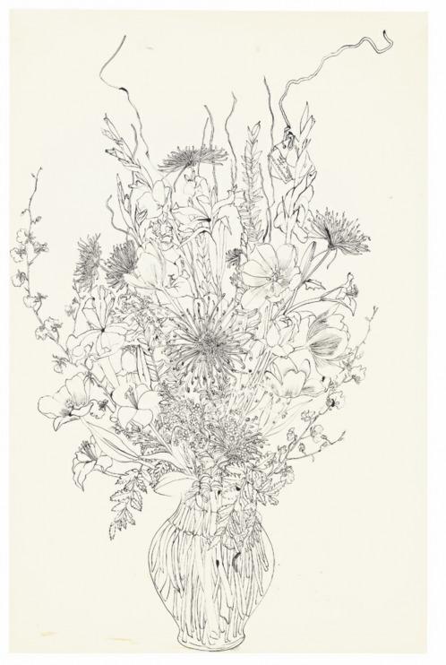 Ao longo de sua carreira, Asawa retornou incansavelmente à representação de plantas e flores, traçando as formas de íris, hortênsias, crisântemos e outras espécies de seu jardim em cadernos dedesenhoeobrassobrepapel.Para Asawa, desenhar a partir da vida era mais do que simples observação; tornou-se um valor e uma forma de engajamento com o mundo e com o presente.“Avidadesenha”,escreveu certa vez, expressando como os acontecimentos e objetos ao seu redormoldavamseutrabalho.