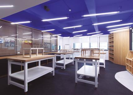 À esquerda do sol central, a maquetaria mantém viva a tradição manual da arquitetura com bancadas altas, ferramentas diversas e armários de madeira especialmente projetados para armazenar maquetes. O piso de pneus reciclados oferece conforto acústico e sustentabilidade, enquanto o teto azul vibrante conecta este espaço ao conceito solar que unifica todo o laboratório