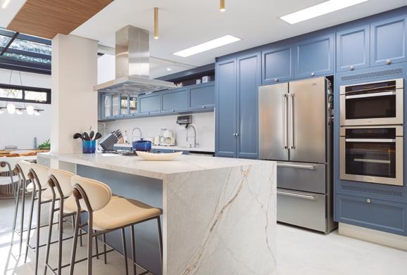 A cozinha é o grande xodó da família. Com inspiração provençal, recebeu um tom azul suave aliado à praticidade da bancada em lâmina sinterizada, resultando em um ambiente charmoso e funcional. Entre os ambientes sociais, merece destaque a adega em madeira, desenhada para armazenar vinhos, cristais e garrafas especiais, incluindo ainda uma adega climatizada. Esse espaço se tornou ponto de encontro em reuniões e celebrações.