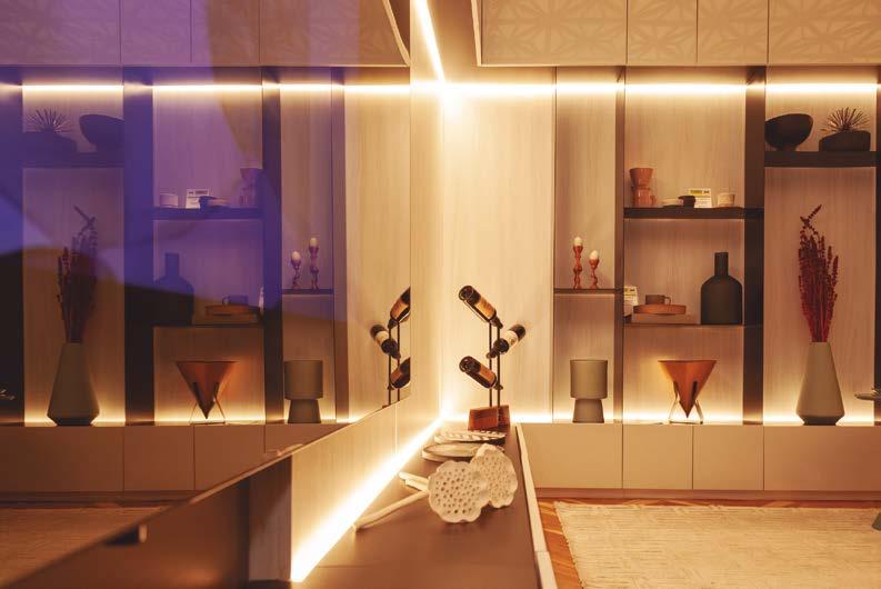 CCom duas crianças, uma de 3 e outra de 7 anos, o jovem casal buscou Roberta Saes e Flávia Nobre, do Meet Arquitetura, para adequarem o novo apartamento da família, priorizando a rotina dos lhos, mas sem deixar a so sticação e o aconchego de lado! Para tornar a morada mais prazerosa, foram aplicadas muitas soluções inteligentes e práticas, como um sistema de TV que corre em um trilho automatizado, a calha úmida na bancada para manter a cozinha em ordem e uma churrasqueira a gás, para desfrutarem de churrascos sem tanta fumaça no interior da casa. Além disso, foram instaladas portas com sistema camarão em marcenaria ripada em tom claro, que trouxe leveza para os ambientes.Um dos principais desa os da dupla de arquitetas foi ampliar o living, integrando toda a cozinha, isolada na planta original, com a área social. Para isso foi necessário levar pontos de água e gás para a sala e transformar a lavanderia em um lavabo. O grande destaque ca para a brinquedoteca camu ada em uma sala moderna, separada pelas portas em marcenaria ripada, um cantinho perfeito para as crianças. Para o piso, o escritório escolheu o porcelanato Saint Martin, da Portobello Shop Santo André, utilizado em toda a área social, incluindo a área gourmet, na cor cinza que harmoniza com os acabamentos e eletrodomésticos.