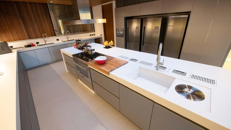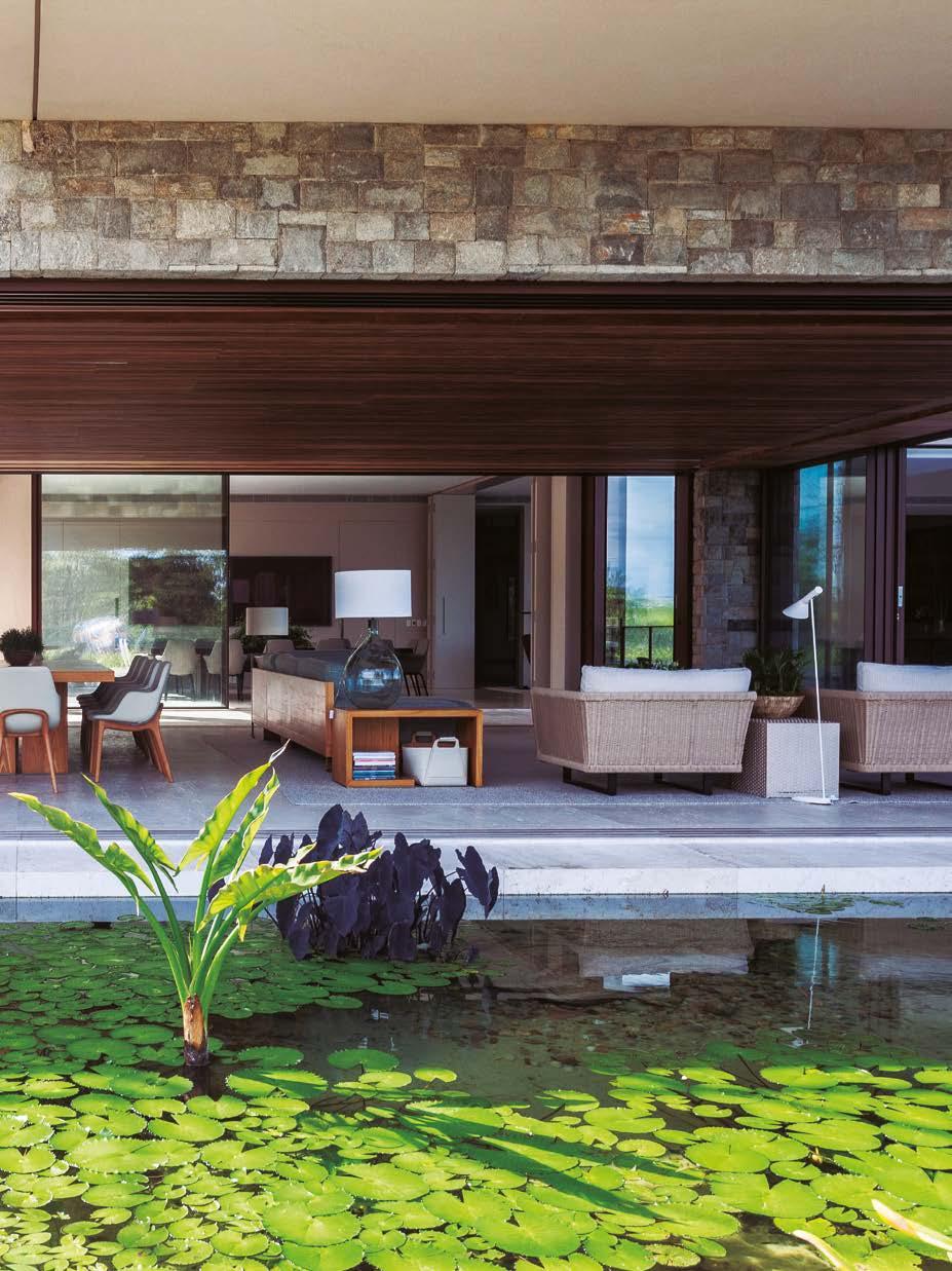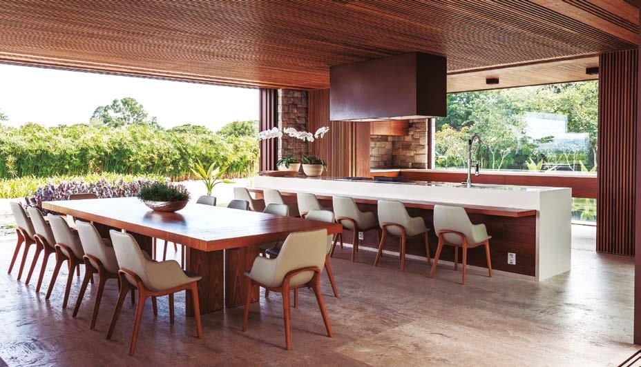 Um lago artificial contorna toda a área de gastronomia da casa, um dos espaços mais utilizados pela família, que adora receber amigos. A arquitetura tem uma integração afinada com o paisagismo, assinado por Alex Hanazaki.
