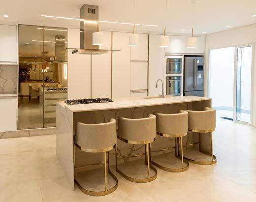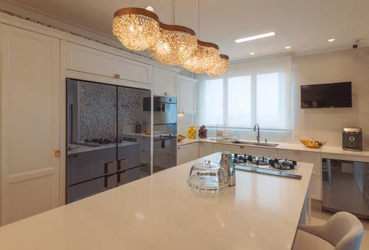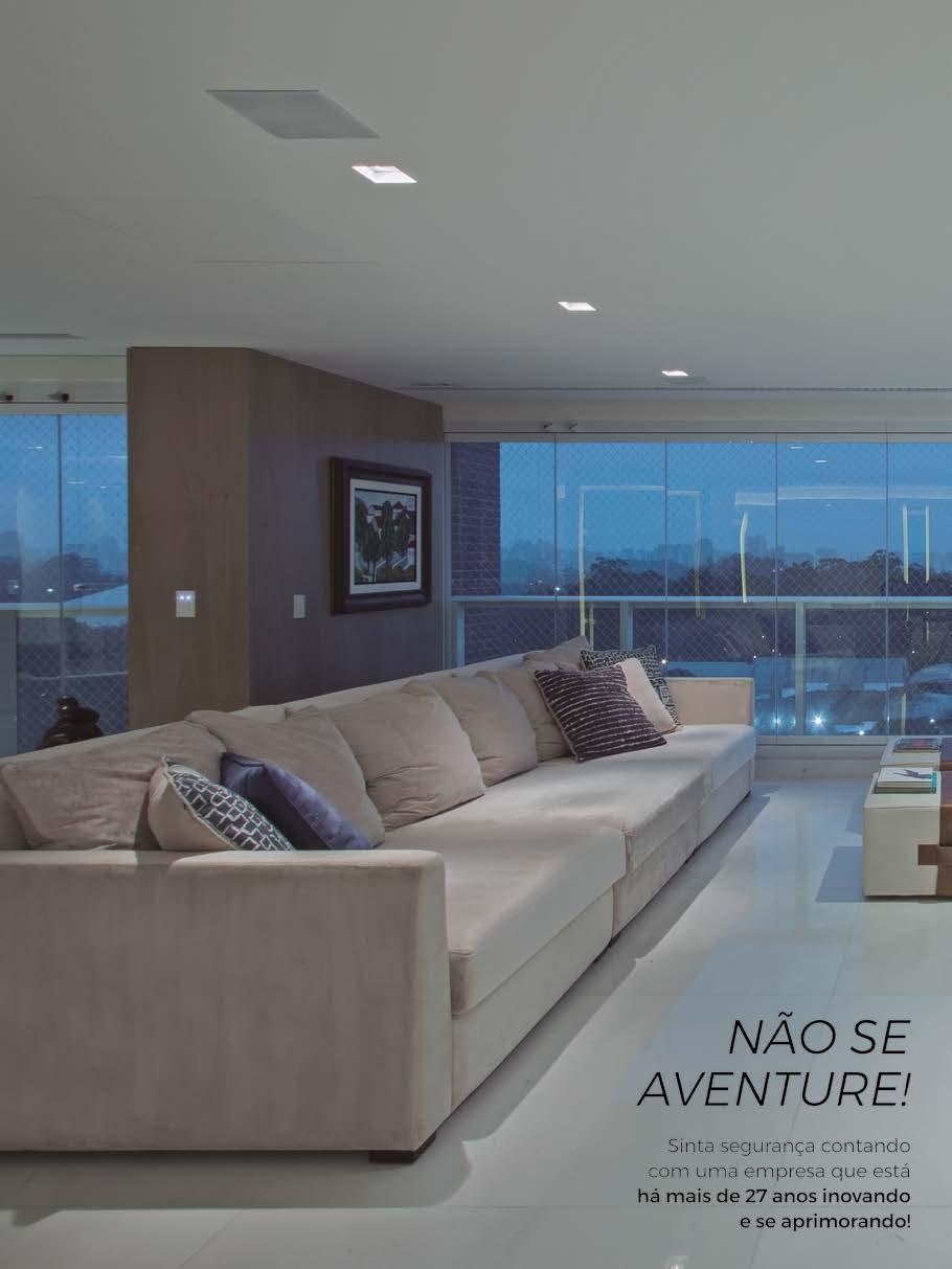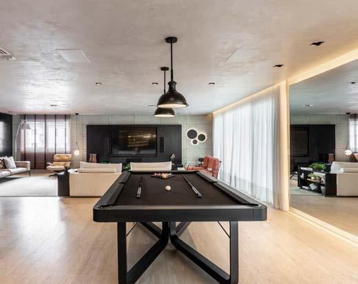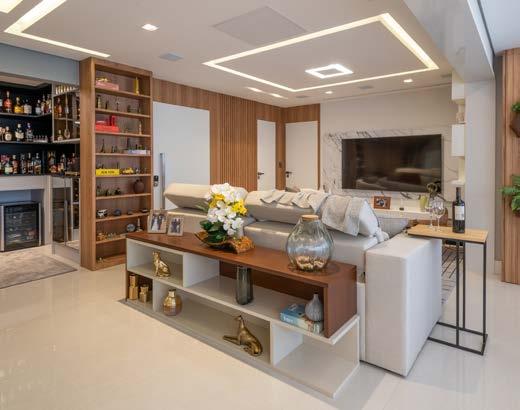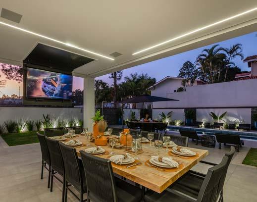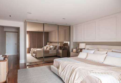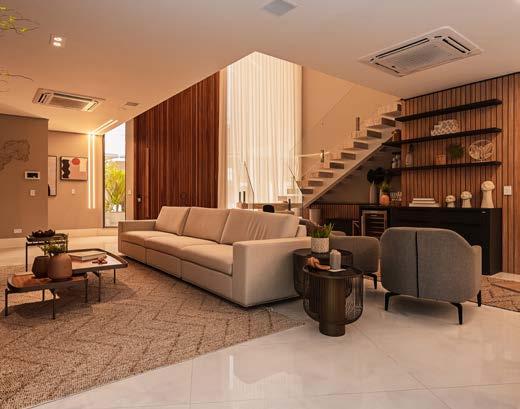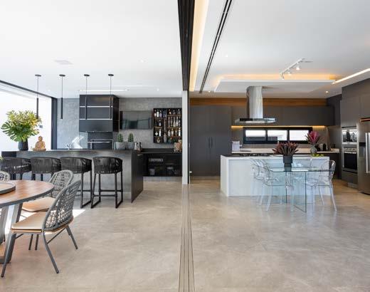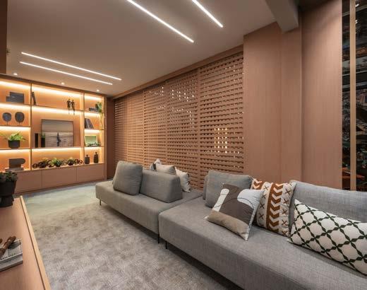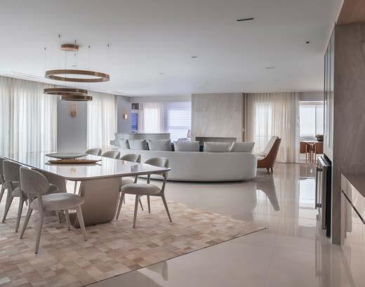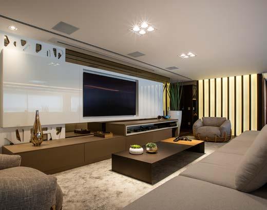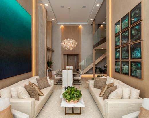 Living, Home Theater, Sala de almoço, Sala com lareira, Espaço Gourmet, Cozinha, Lavanderia, Academia, seis Suítes, quatro Lavabos, Sala íntima e a Área de Lazer compõem o lar. A amplitude marca os ambientes interligados e governados pela simetria.