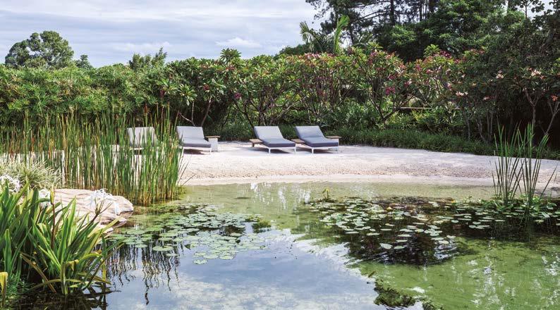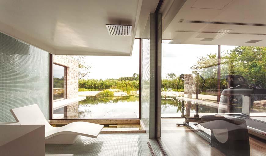 A academia e sauna tem vista incrível para o jardim, com paisagismo de Alex Hanazaki. O lago contorna todos esses ambientes. Quem está na sauna, inclusive, pode mergulhar nesta piscina natural.