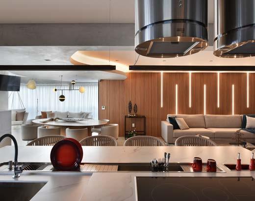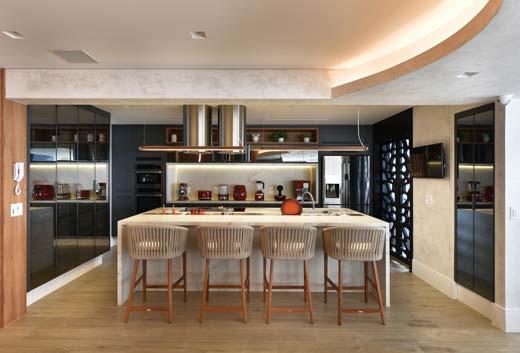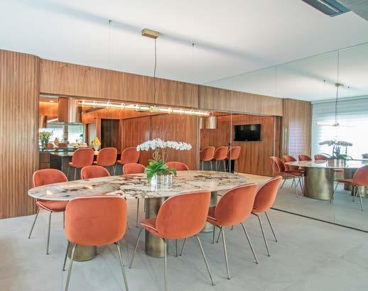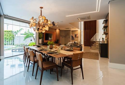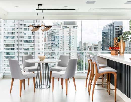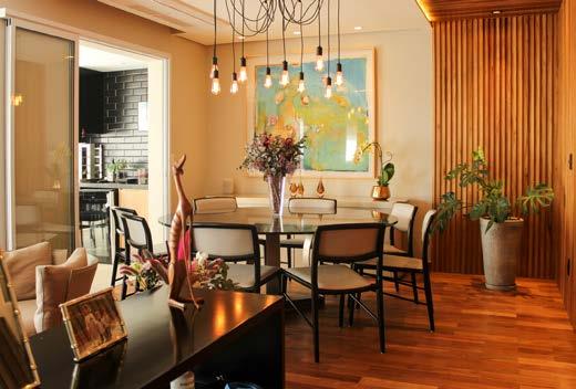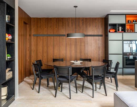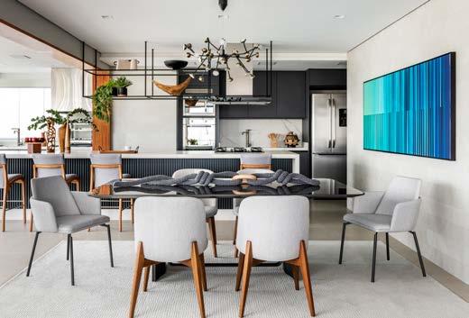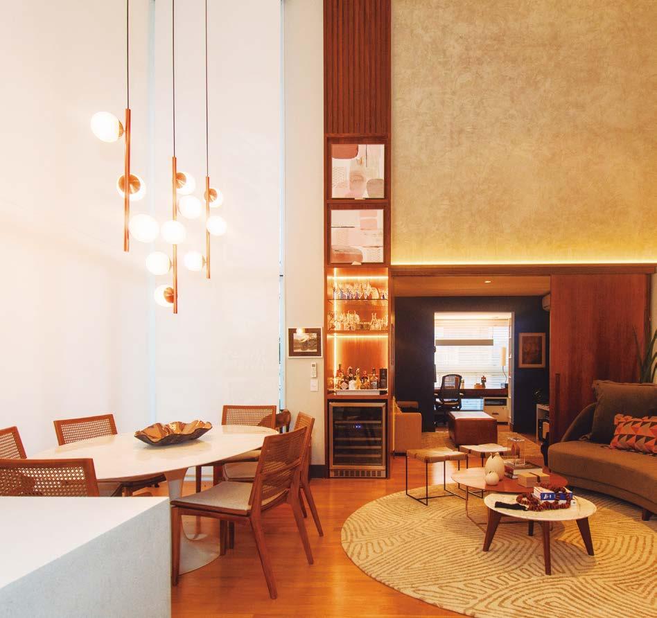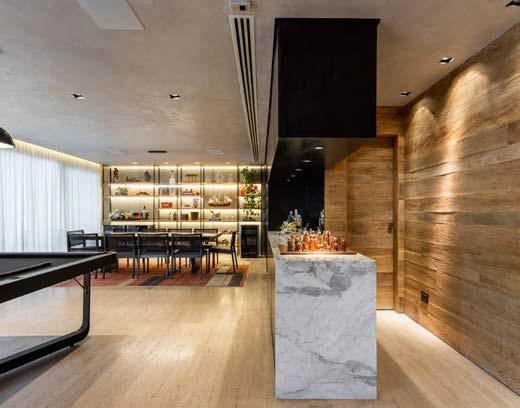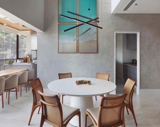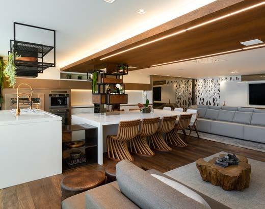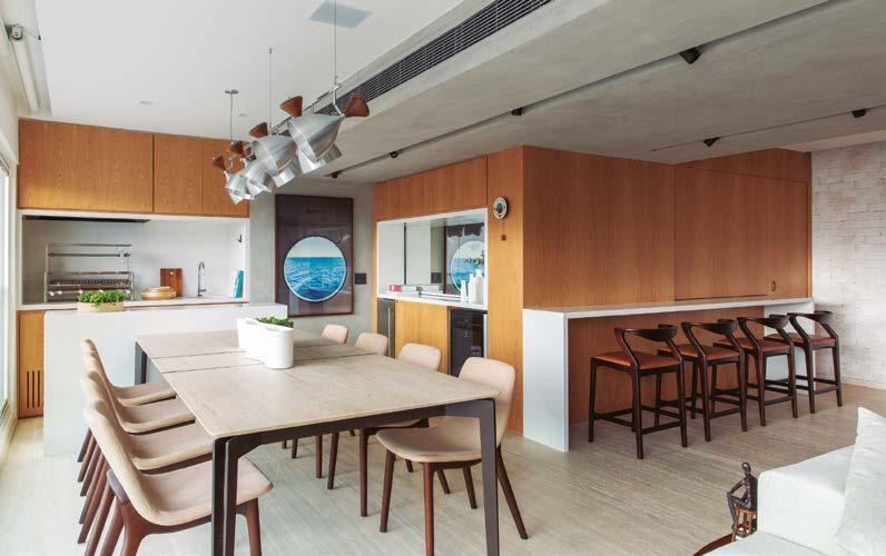 A madeira é protagonista da Cozinha Gourmet, que conta com mesa da Érea. O revestimento de toda parte térrea foi feito com mármore.