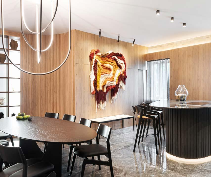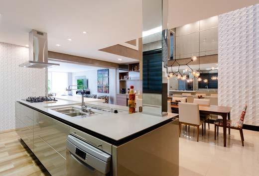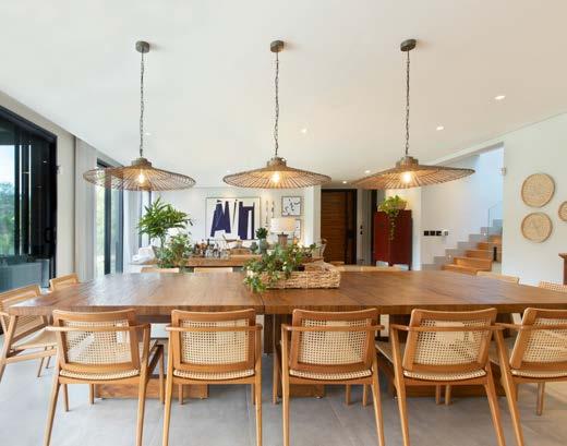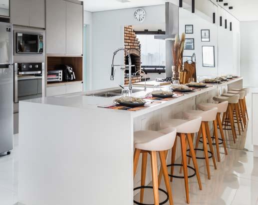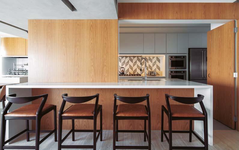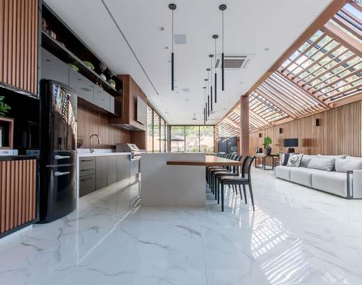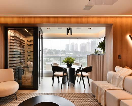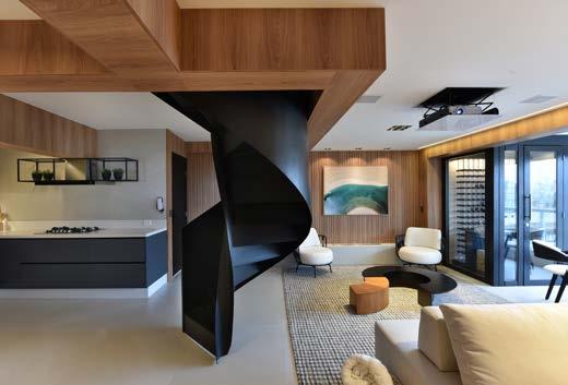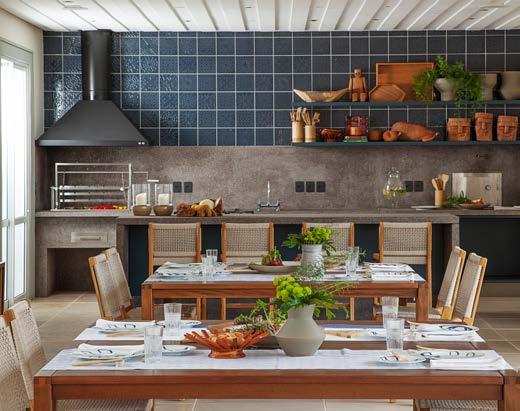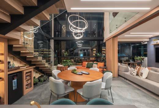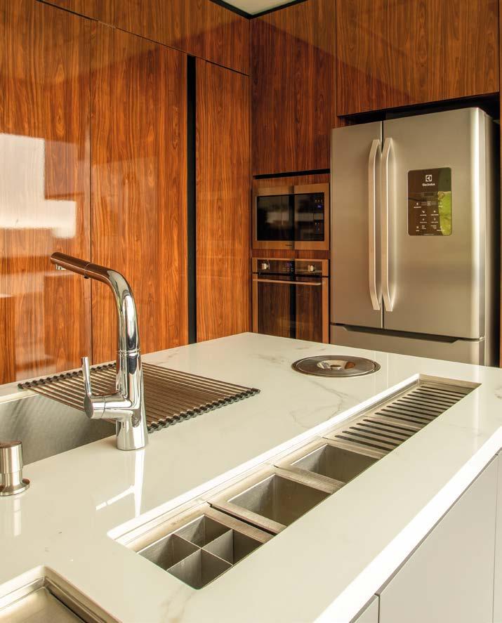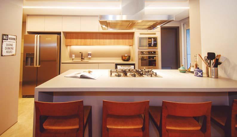 A madeira é protagonista da Cozinha Gourmet, que conta com mesa da Érea. O revestimento de toda parte térrea foi feito com mármore.