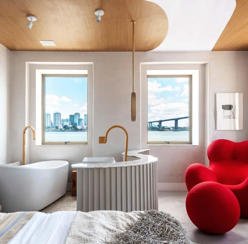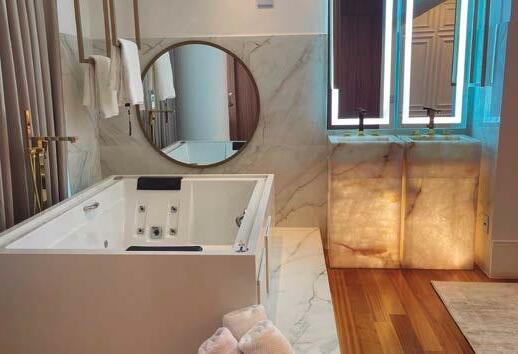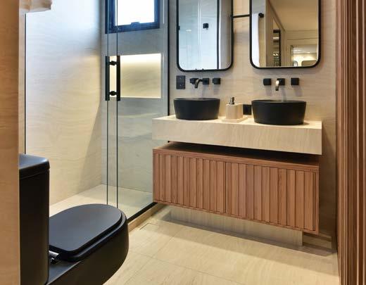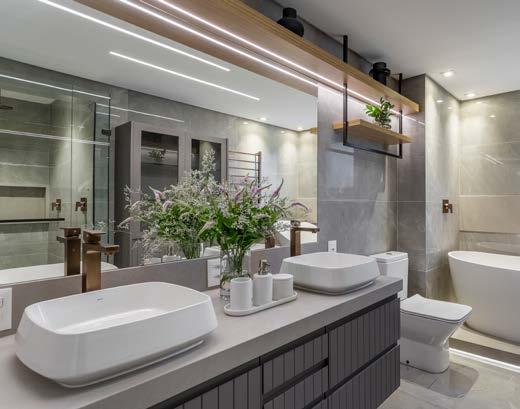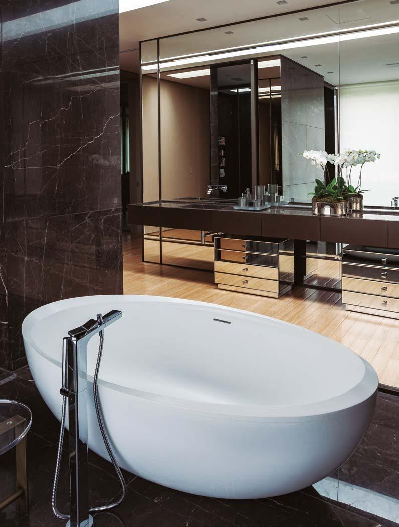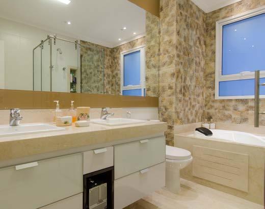 O banheiro da suíte do casal tem áreas privativas separadas. A bancada e a banheira são soltas, deixando o ambiente elegante.