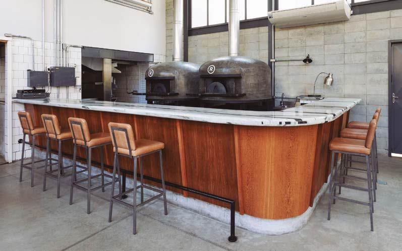 As instalações aparentes são o charme do centro gastronômico. No balcão onde funciona a pizzaria, materiais como a madeira e o couro das poltronas trazem cor para o espaço monocromático.