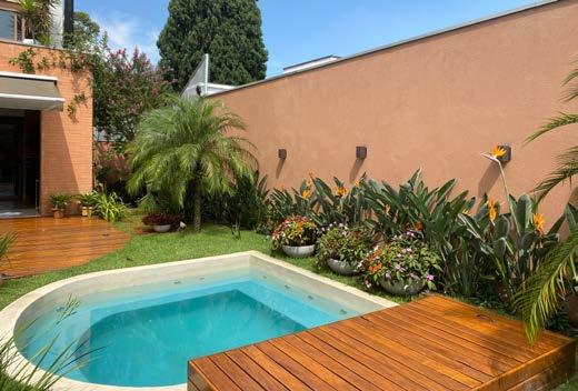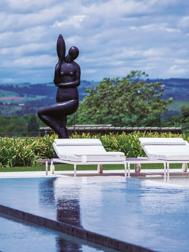 A piscina tem uma perfeita integração com a natureza. No espaço, confortáveis espreguiçadeiras e escultura de Victor Brecheret.