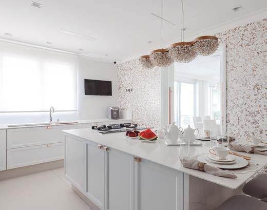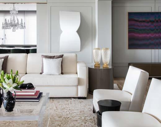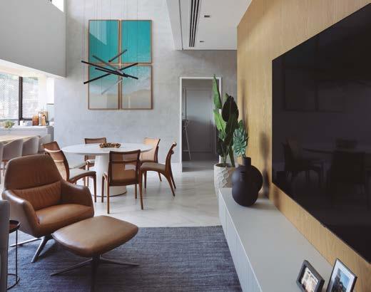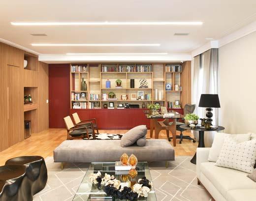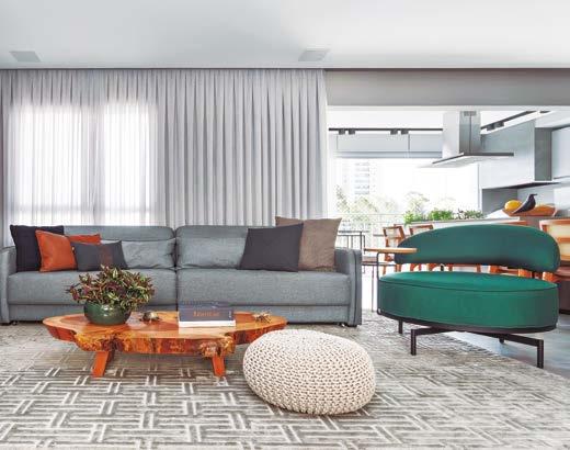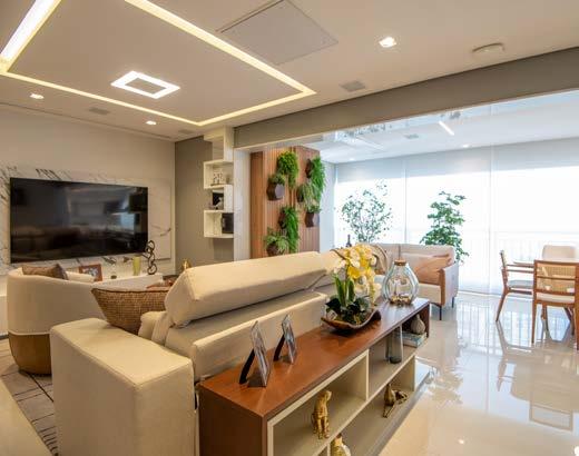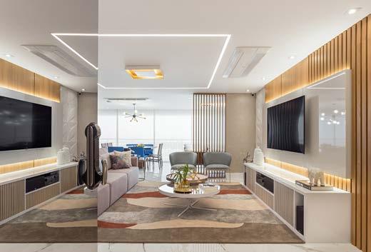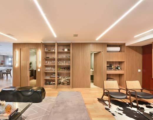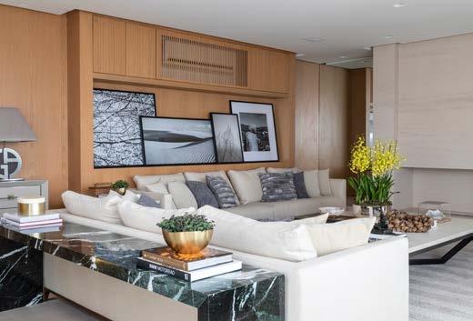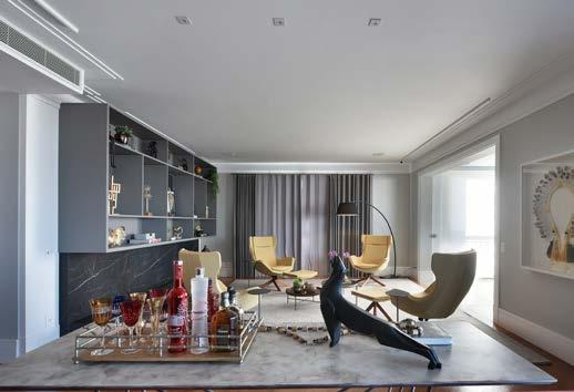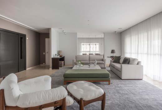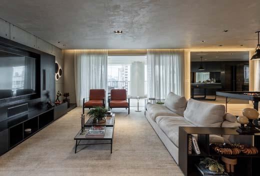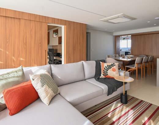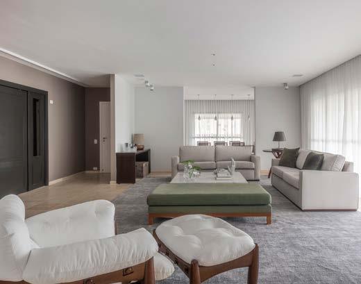 Localizado no bairro Brooklin, o apartamento de 160m² recebeu um projeto para atender a demanda dos proprietários, que queriam um maior aproveitamento entre os espaços. Foi a partir da viga estrutural que atravessa a área social e que originalmente dividia o living da varanda, que o projeto da sala foi executado e os demais espaços tomaram forma. Com