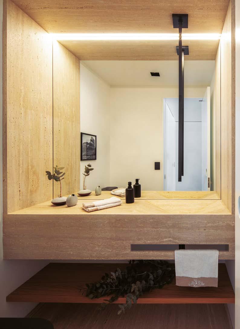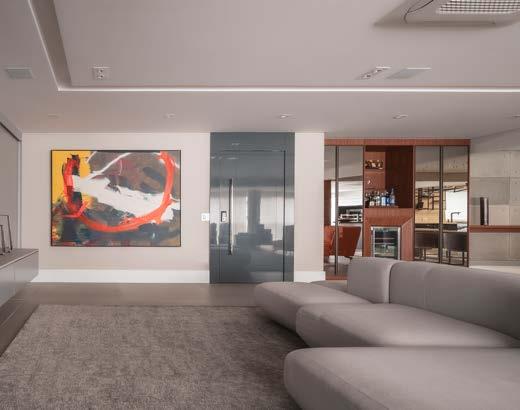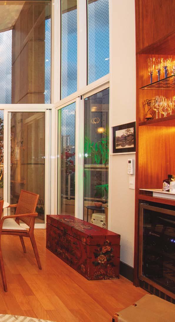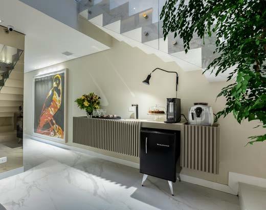 A caixa do elevador é toda de vidro e está em um grande hall, próximo da adega. O pavimento conta, ainda, com dois lavabos sociais.