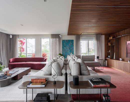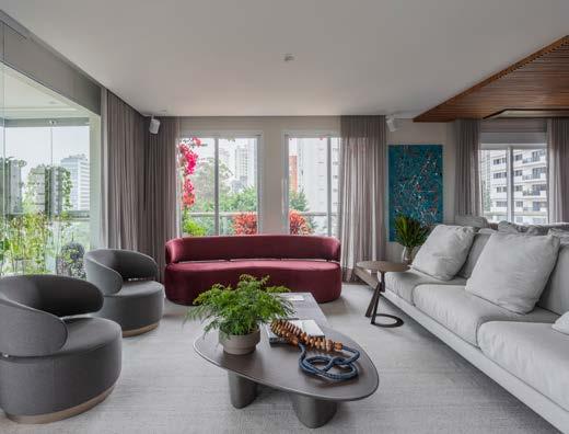 Uma chaise vinho, da marca italiana Minotti, faz a integração dos ambientes. Os espaços são marcados pela simetria e os panos de vidro valorizam a iluminação natural.