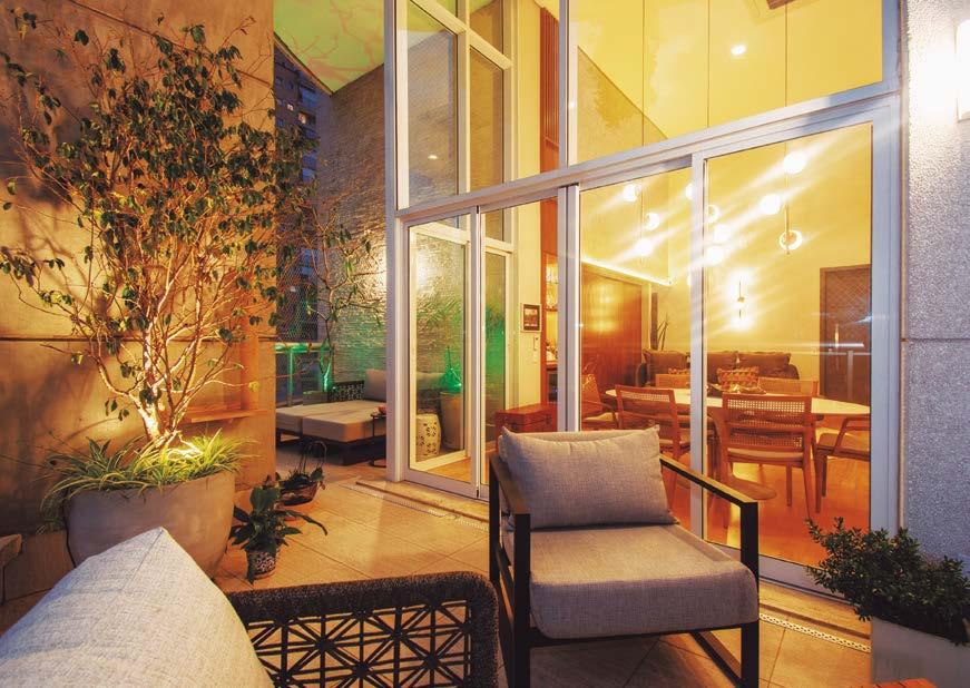 Aos fundos, o espaço que foi fechado com vidro recebe iluminação natural, que oferece uma estética agradável e proporciona sensação de conforto.