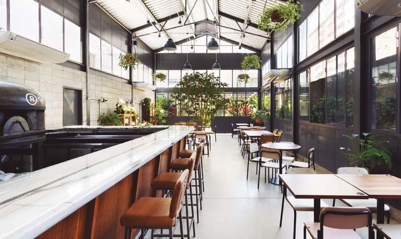 Seguindo para a parte de trás, há um grande galpão onde fica a área do restaurante e pizzaria. Seu estilo industrial contrapõe com toda a delicadeza do restauro do espaço, que foi desenvolvido em chapas de aço, vidro e peças garimpadas, lembrando grandes galpões antigos, fábricas e manufatura de comida.