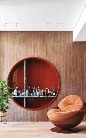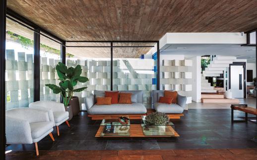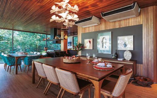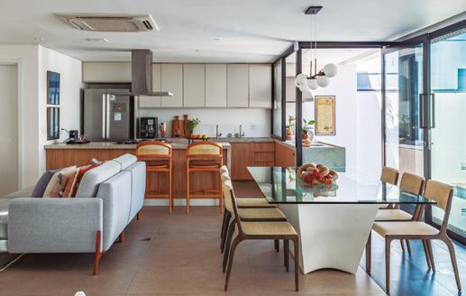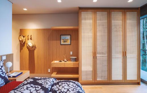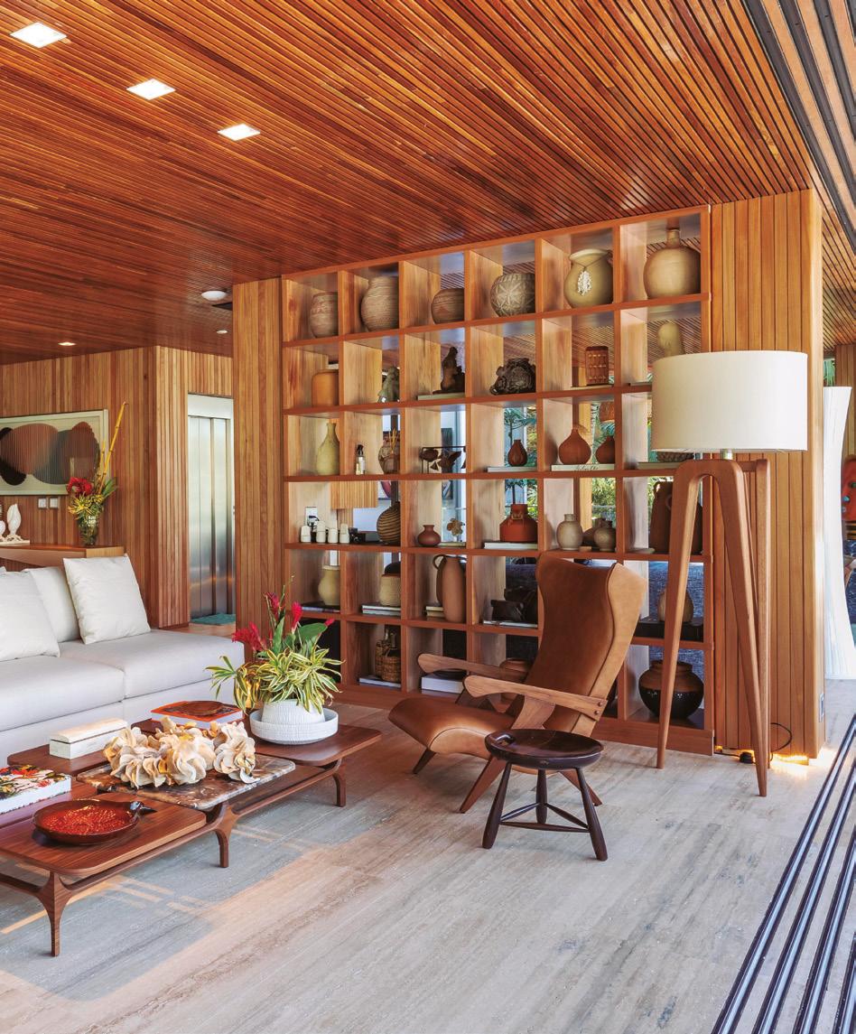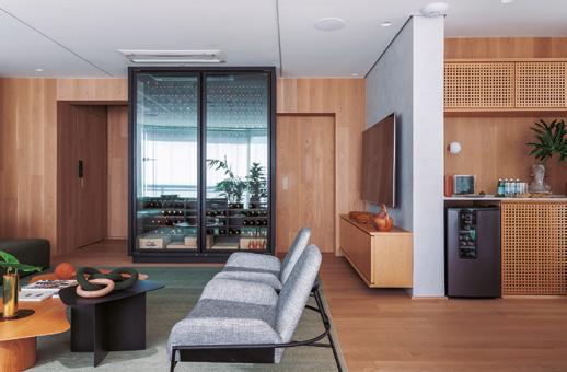 No living a mesma madeira do piso, reveste as paredes e portas que mimetizam os espaços também está na marcenaria com detalhe de muxarabi no bar/adega.