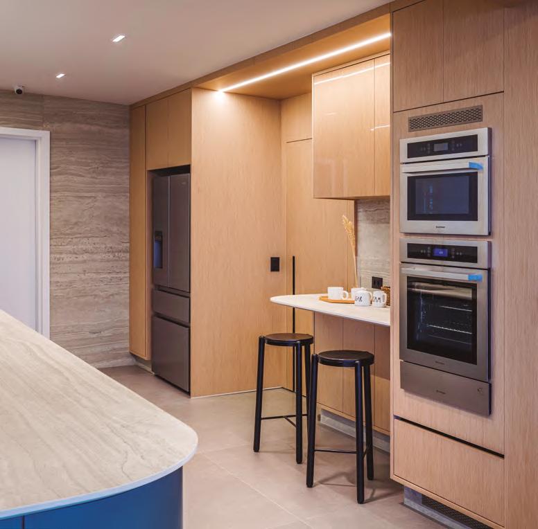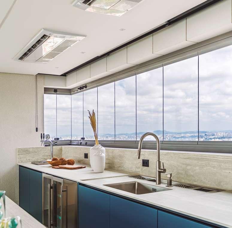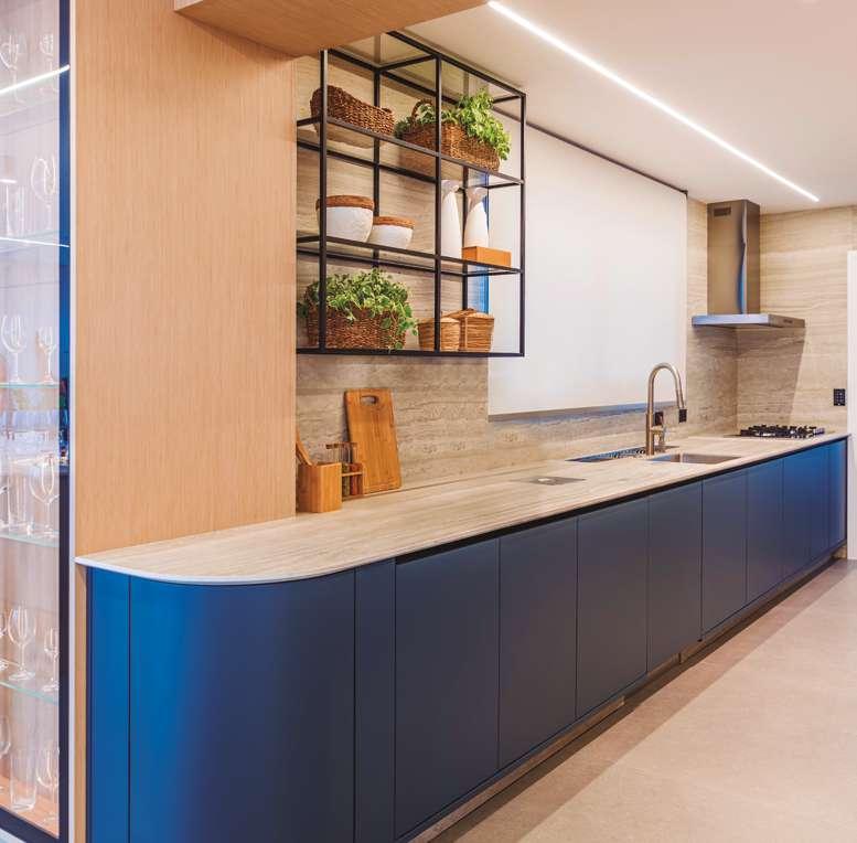 Formas arredondas foram inseridas na área gourmet e também na cozinha, que tem a combinação da madeira e da cor azul na marcenaria executada pela Bontempo. Os eletrodomésticos da Elettromec unem design e praticidade ao ambiente
