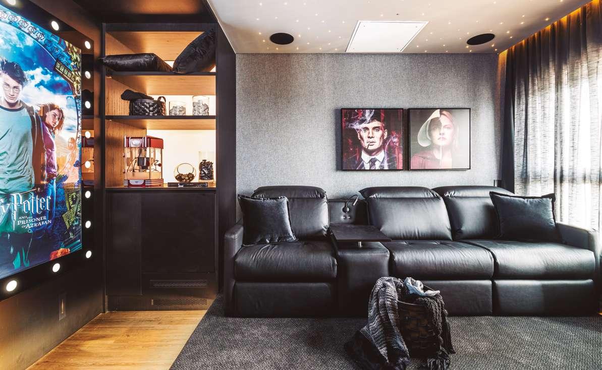 A sala de cinema tem detalhes intimistas, com papel de parede acinzentado, marcenaria e poltronas pretas. Quadros com filmes e personagens adorados pela família arrematam a decoração
