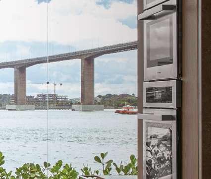 e facilitar a inserção de elementos, como a ilha da cozinha complementada com espaço para refeições. Painéis de madeira revestem as paredes e tons de cinza refletem a atmosfera masculina na decoração. No dormitório, ao lado da confortável cama fornecida pela Decor American, há um espaço para estudos com vista para o bairro. Sobre a marca de camas e colchões a arquiteta enfatiza: “Nossa