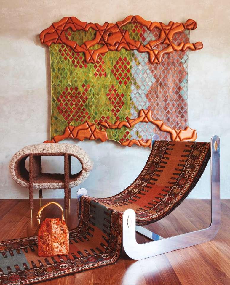 Um dos lançamentos da by Kamy nesta DW! foi a linha Modulus, criada pelo arquiteto e designer Henrique Steyer. A série é composta por peças multifacetadas que criam um efeito prismático cheio de movimento. Todas são revestidas por partes de antigos tapetes orientais e podem ser usadas como mesas, pufes e, se empilhadas, compõem biombos e até estantes de grandes vãos. É o típico produto coringa que, com a nossa brasilidade, dá um novo significado a fragmentos preciosos da cultura oriental.