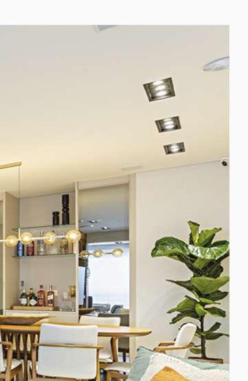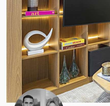 contribuiu para a criação de um ambiente mais claro e espaçoso. As portas mimetizadas no painel ripado são o detalhe que adiciona sofisticação ao projeto e esconde a entrada para a cozinha e a suíte master. Na decoração, elementos naturais deixam o living sereno e acolhedor, em harmonia com o desejo da cliente de estar sempre próxima à natureza.