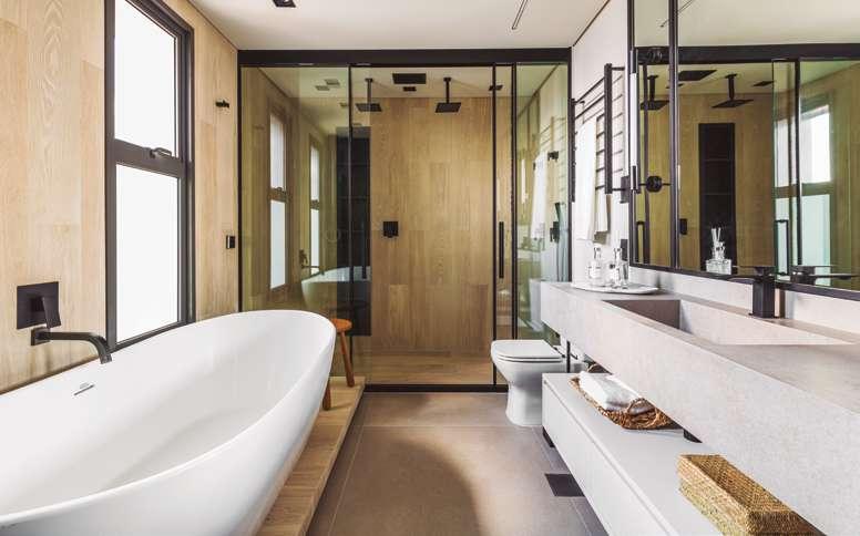 A sala de banho é um templo de relaxamento e recebeu revestimentos em madeira, banheira de observação e metais na cor preta com acabamento fosco