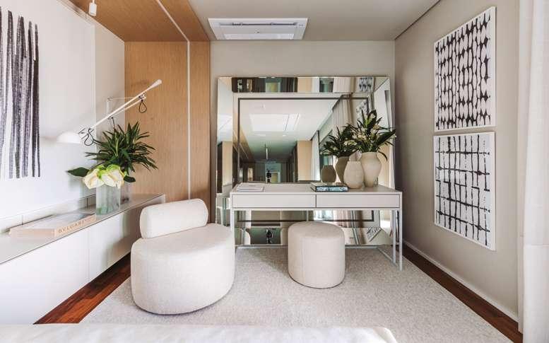 A suíte master carrega a atmosfera acolhedora e neutra, com diversos elementos monocromáticos. O pórtico e o piso em madeira, aquecem e trazem elegância e conforto para o ambiente