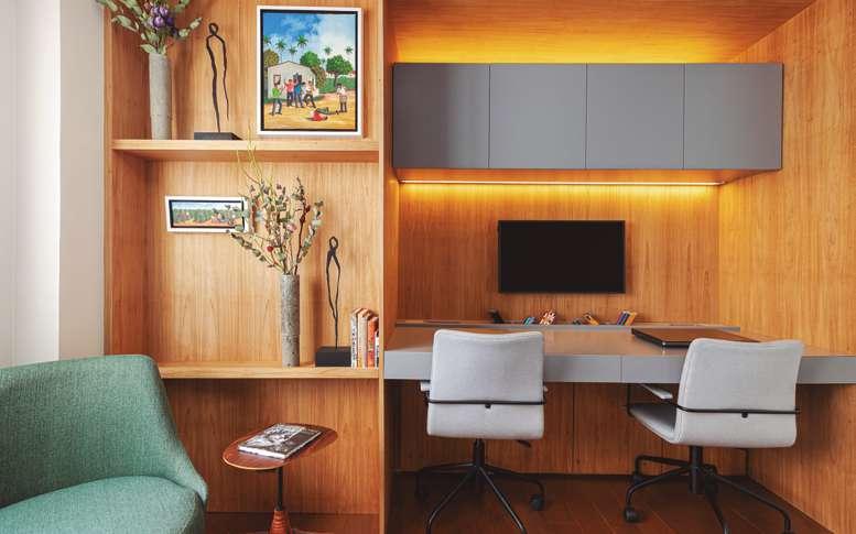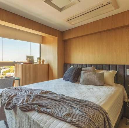 e facilitar a inserção de elementos, como a ilha da cozinha complementada com espaço para refeições. Painéis de madeira revestem as paredes e tons de cinza refletem a atmosfera masculina na decoração. No dormitório, ao lado da confortável cama fornecida pela Decor American, há um espaço para estudos com vista para o bairro. Sobre a marca de camas e colchões a arquiteta enfatiza: “Nossa
