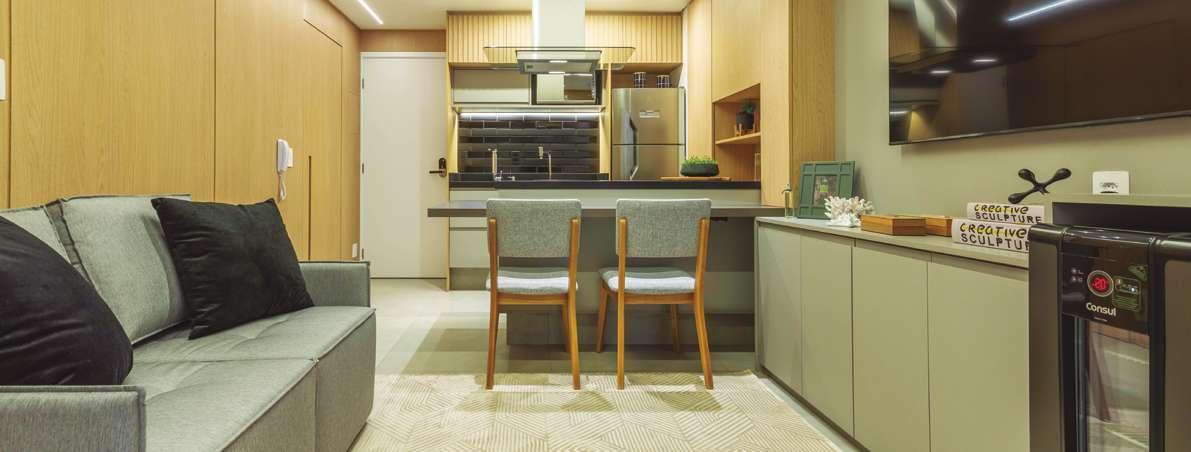 Um apartamento compacto e com poucas divisões ganhou nova cara com o máximo de aproveitamento dos espaços com projeto do escritório Kalitin Interiores. O futuro morador, um jovem que ganhou seu primeiro apartamento, precisava de espaços funcionais e confortáveis para o dia a dia. Com pouca alteração estrutural, a sacada foi integrada à área social para ampliar