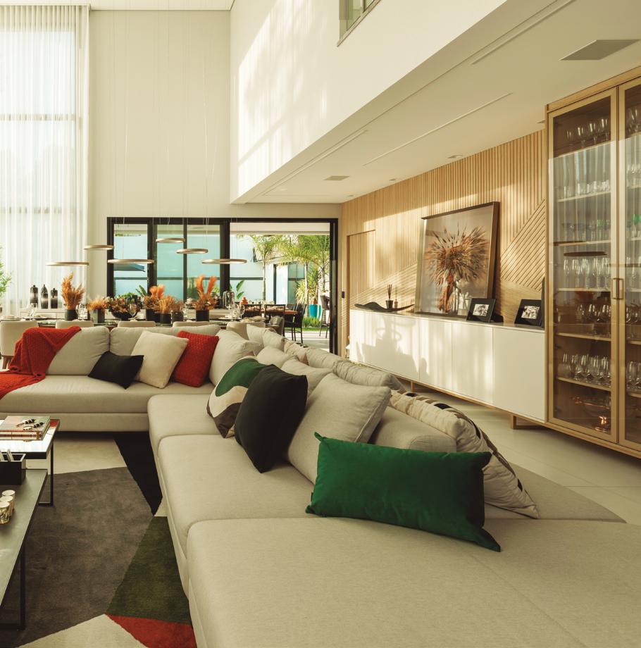 Ao adentrar a casa, o estar integrado à sala de jantar chama a atenção pelo pé-direito duplo, que amplia a sensação de espaço e permite a entrada abundante de luz natural. Os mobiliários são da Full House.