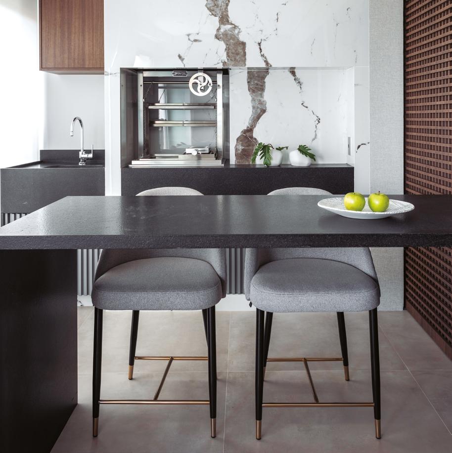 Com 150 m², este apartamento em Moema, São Paulo, foi reformulado para atender às necessidades de um casal que buscava amplitude, conforto e organização. Assinado pela arquiteta Daiane Altinolfi, o projeto apostou em um layout inteligente, com a sala de jantar deslocada para o terraço e a cozinha mantida fechada, mas com integração visual. Os interiores se apoiam em tons de cinza, madeira, espelho fumê e superfícies tecnológicas. Destaque para os revestimentos da Portobello, como o porcelanato Superquadra Concreto, aplicado em todo o piso, e a lastra Calacatta Puro Chain, que aparece no painel do home theater e na bancada da churrasqueira. “Valorizo fornecedores que entregam estética, durabilidade e inovação com consistência. A Portobello oferece soluções completas, com variedade de acabamentos e alto padrão técnico, que se alinham perfeitamente à proposta dos meus projetos e ao nível de exigência dos meus clientes”, afirma Daiane.