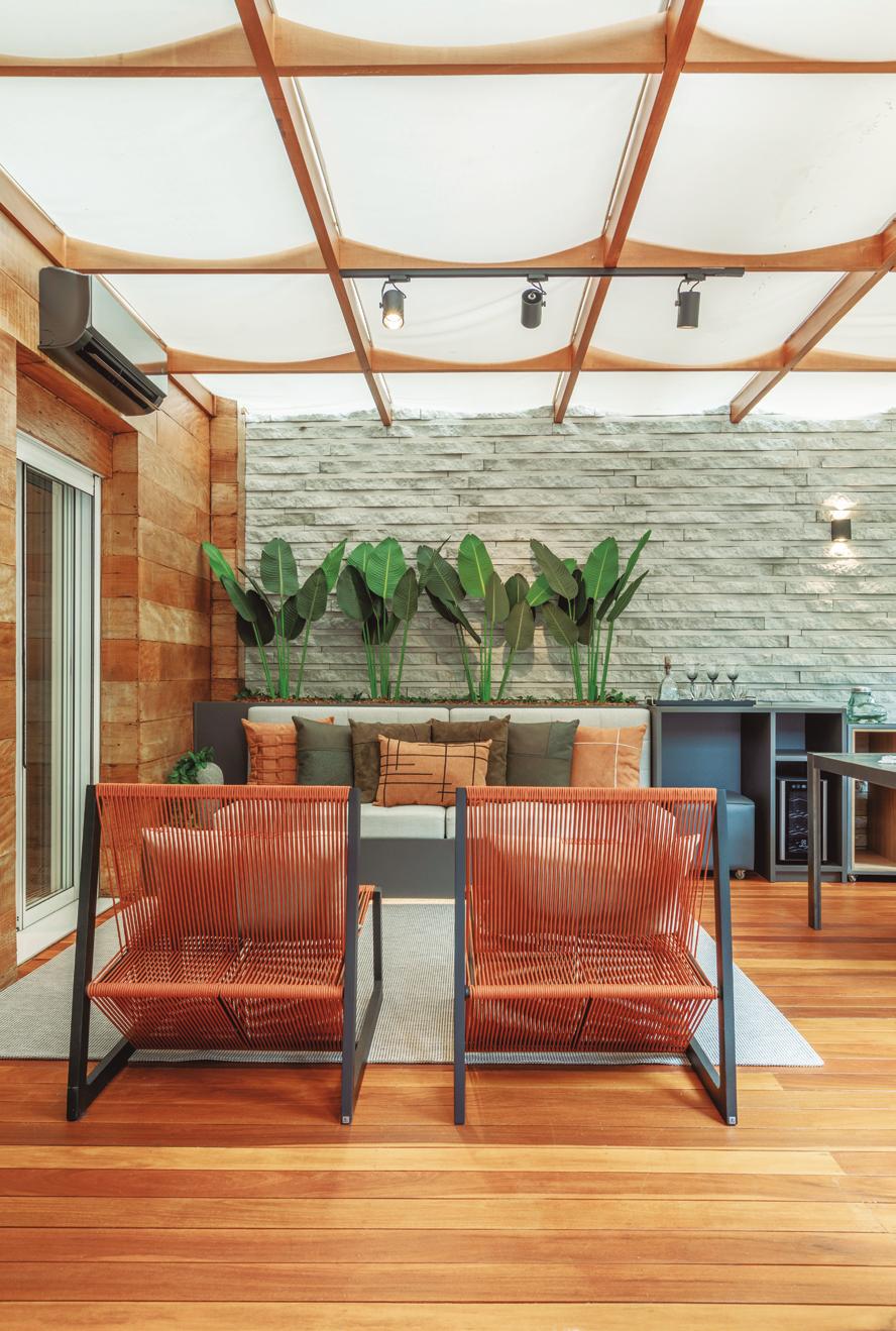 A transferência da sala de jantar para o terraço resultou em um espaço gourmet sofisticado. A lastra Calacatta Puro Chain da Portobello na bancada da churrasqueira conecta os ambientes, enquanto a marcenaria sob medida alia praticidade e elegância ao espaço externo