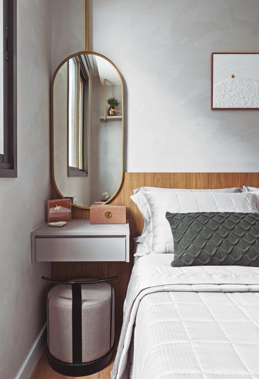 No dormitório, a cabeceira antiga deu lugar a uma versão discreta e funcional da Mobille Tatuapé, com iluminação embutida que garante mais conforto ao ambiente