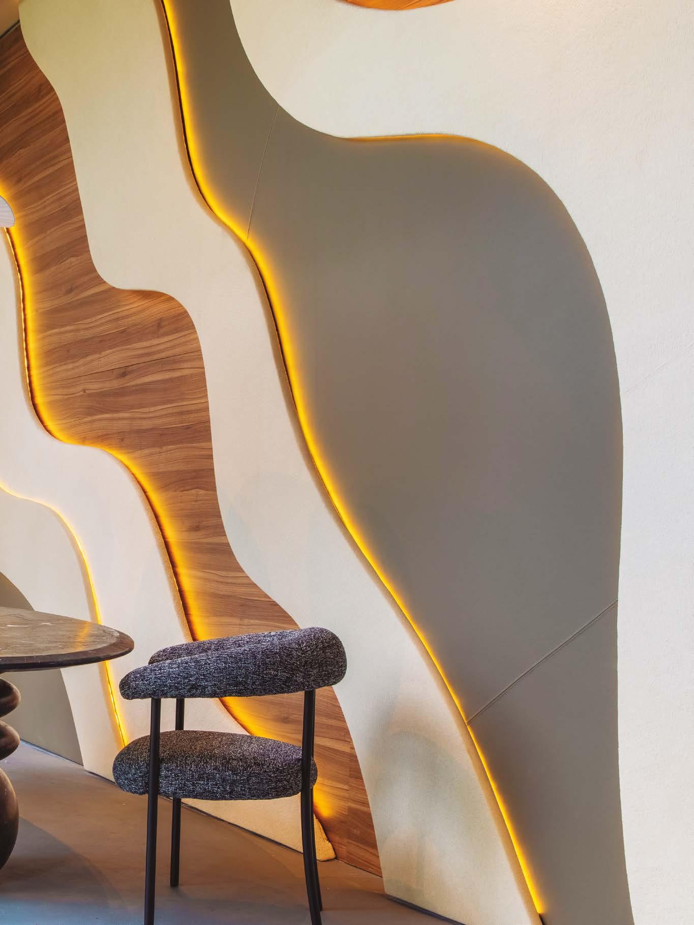 Para a sala de jantar da mostra Bed and Room, a arquiteta idealizou um espaço que valoriza a sofisticação e elegância. Para isso, integrou um painel de parede que incorpora linhas curvas, introduzindo elementos orgânicos em nuances de fendi, em perfeita harmonia com a iluminação destacada pelas luminárias “Plissé” em tecido algodão, elaboradas pelo Studio +LED. A mesa de jantar oval em preto é da Delara, produzida no Líbano com mármore espanhol Nero Marquina e com design de Mohamed Orra, juntamente com as cadeiras assinadas pelo designer Esteban Fidelis completam de forma impecável o visual desejado.