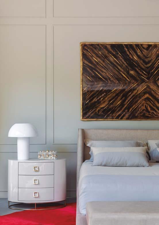 O quarto projetado pela arquiteta Ana Rozenblit é um espaço romântico e contemporâneo com a cor greige predominante. O ambiente conta com o tapete “Happiness” desenhado pela arquiteta e cama personalizada com LED na parte de baixo e USB dentro das gavetas do criado mudo aveludado. A poltrona Mole vintage de Sérgio Rodrigues dá um charme modernista ao espaço e o conceito do ambiente foi transformar o que já existe, inspirado nos projetos do escritório Spaço Interior com uma nova configuração.