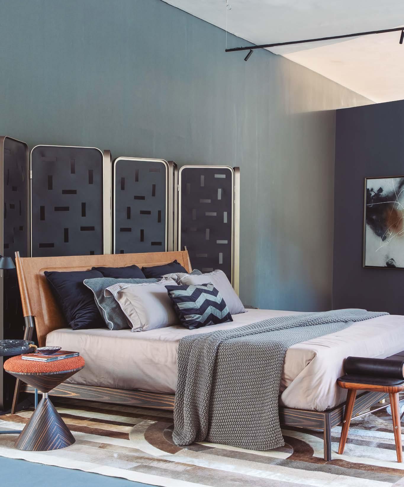 O quarto transmite personalidade distinta e estilo de vida dinâmico de um empresário moderno. Com as tonalidades pretas, cinza e marrom, o ambiente sofisticado tem a cama com a cabeceira em couro caramelo e estrutura em madeira ébano catedral, com lençóis de algodão egípcio em tons neutros e uma colcha de tecido luxuoso da Muguet Home. As peças da Bed and Room escolhidas para exibição são o biombo Cobogó de couro com estrutura metálica, e o tapete em couro, que tornam o espaço mais exclusivo e luxuoso, com impacto estético visual na decoração.